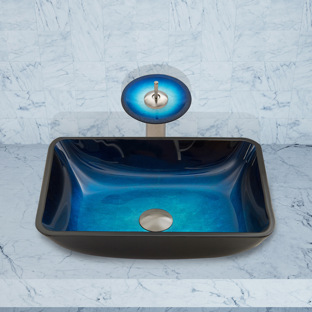 Inspired by the waters of the Caribbean, the VIGO Rectangular Turquois Water vessel sink will be the center of attention in your bathroom. The ombre style of this rectangular vessel sink makes it unique.