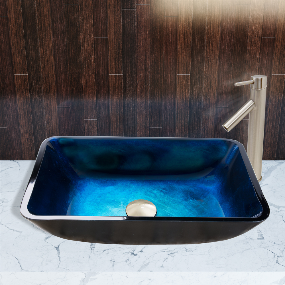 The VG07068 Rectangular Turquois Water glass vessel sink features an ombre style of sapphire blue colors, resembling the deep waters of the Caribbean.