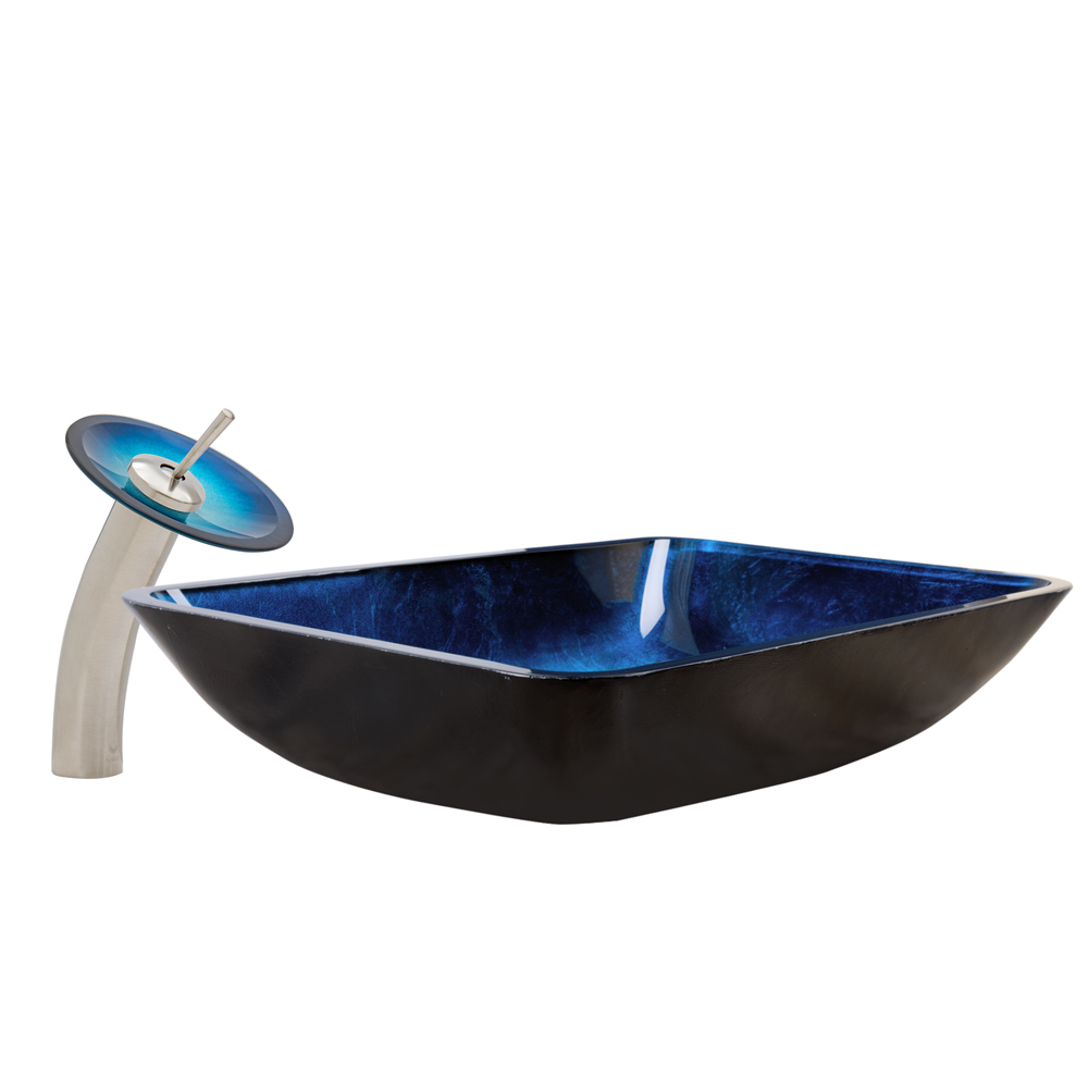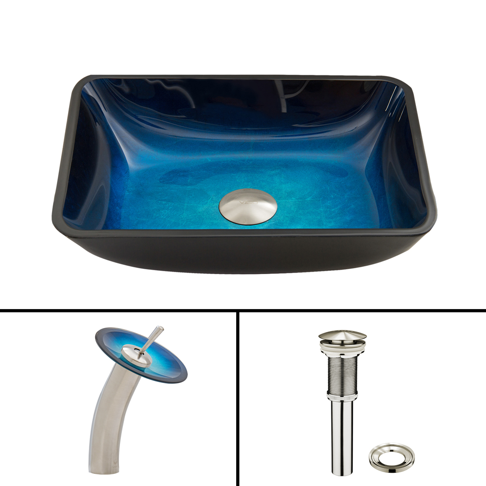 The VIGO Rectangular Turquoise Water Glass Vessel Sink and Waterfall Faucet Set in Brushed Nickel Finish will turn your bathroom into an exotic and sought after destination.