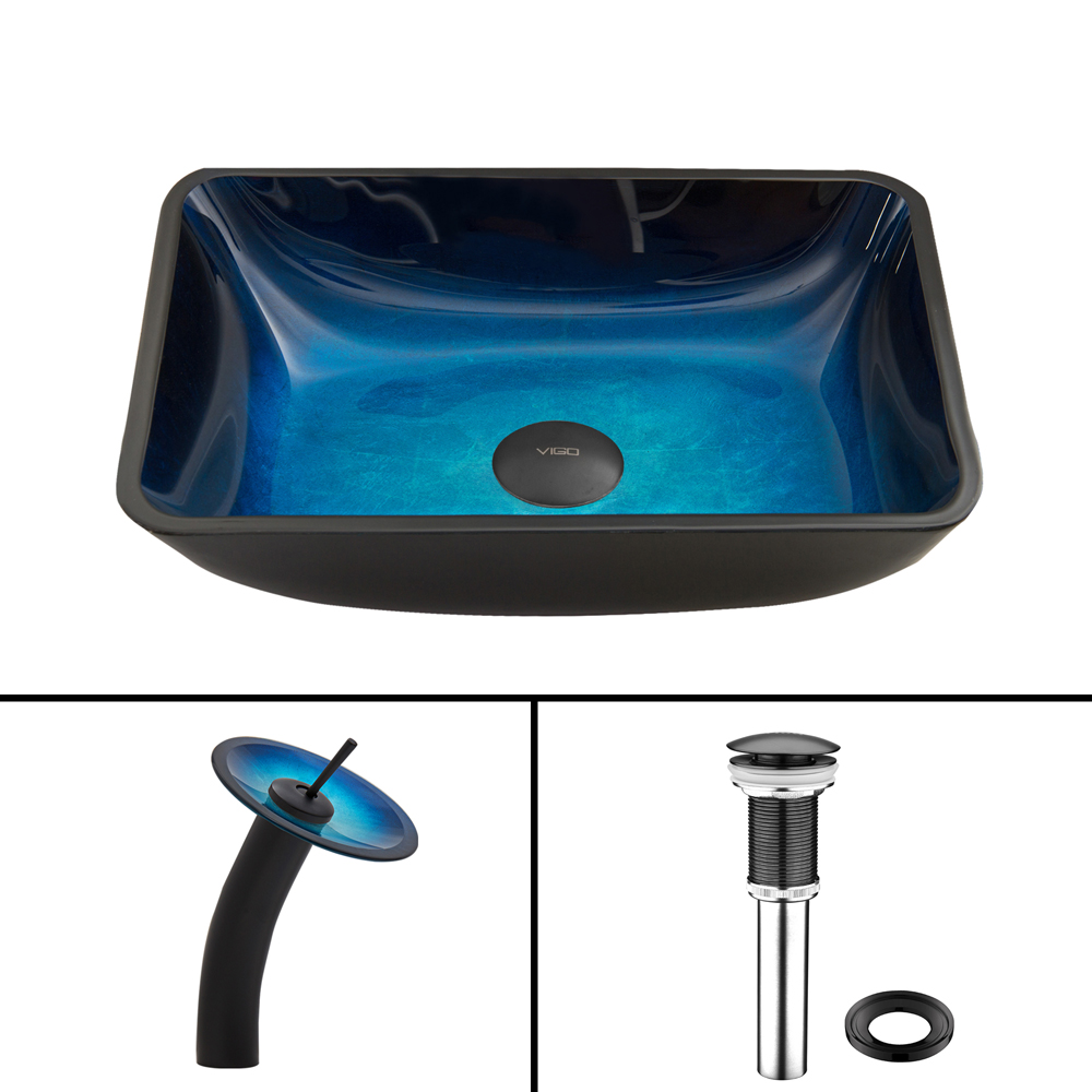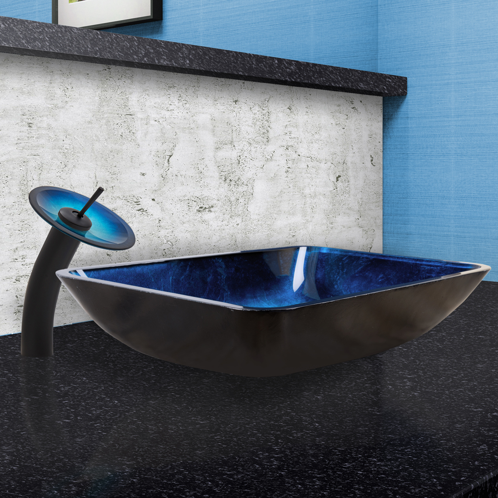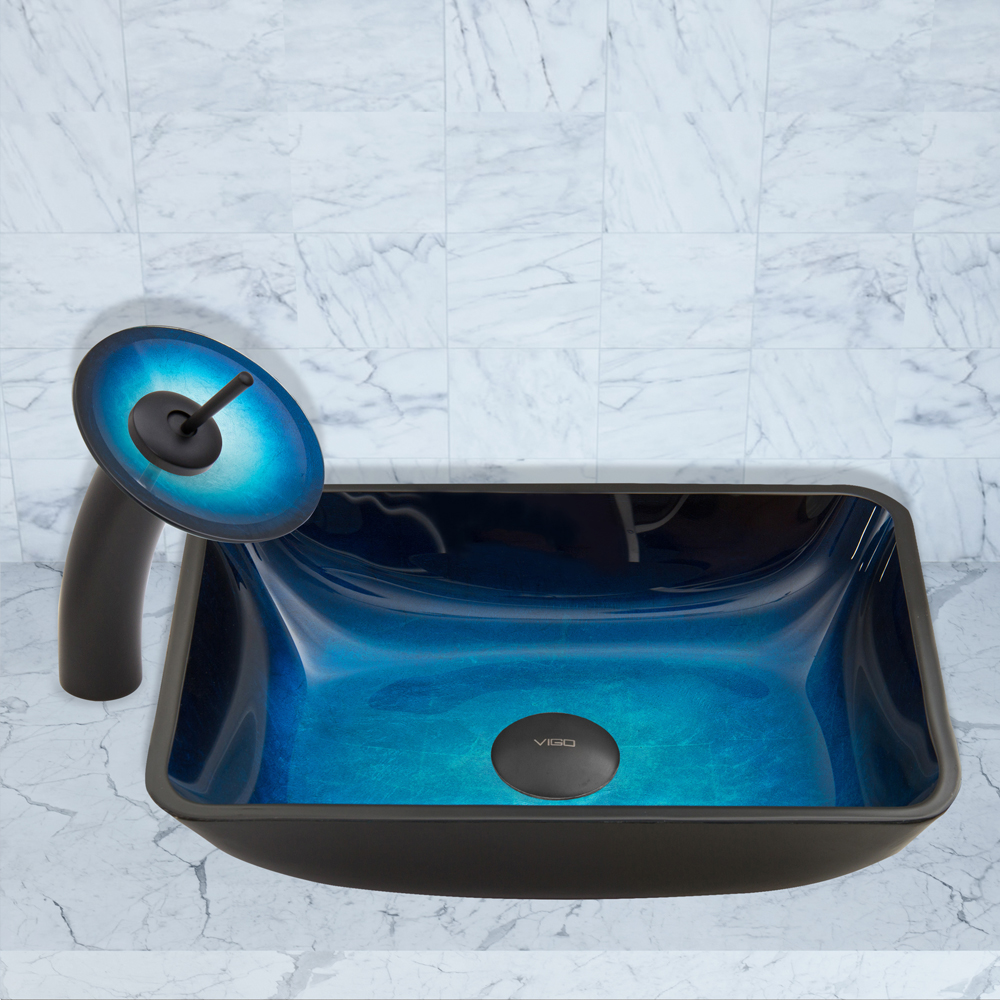 The VIGO Rectangular Turquoise Water Glass Vessel Sink and Waterfall Faucet Set in Matte Black Finish will turn your bathroom into an exotic and sought after destination.