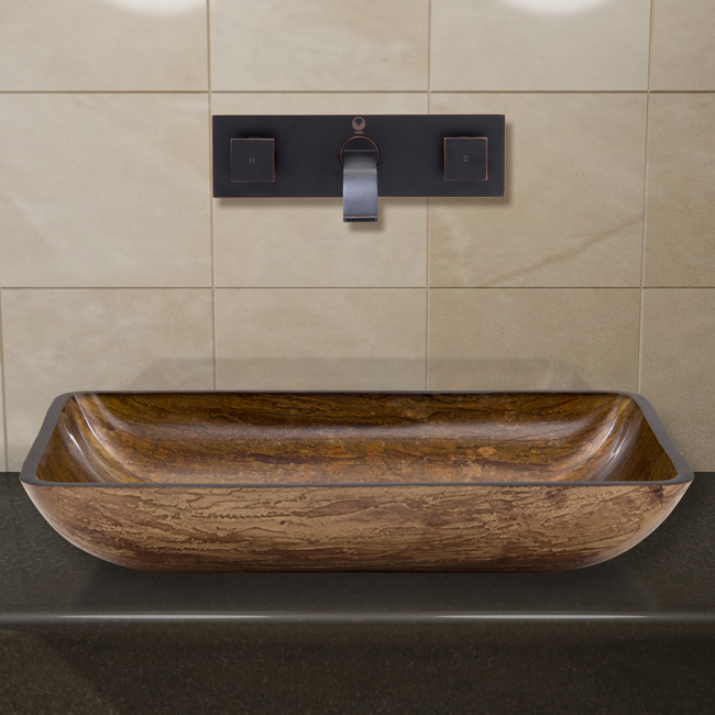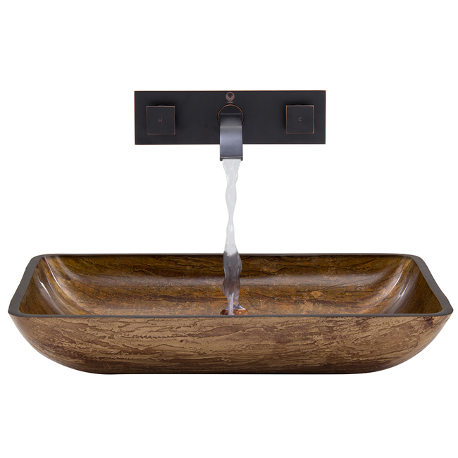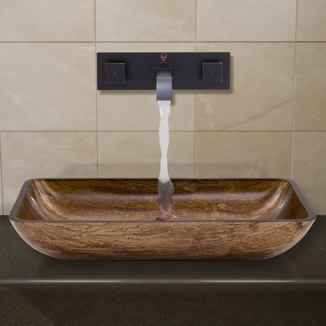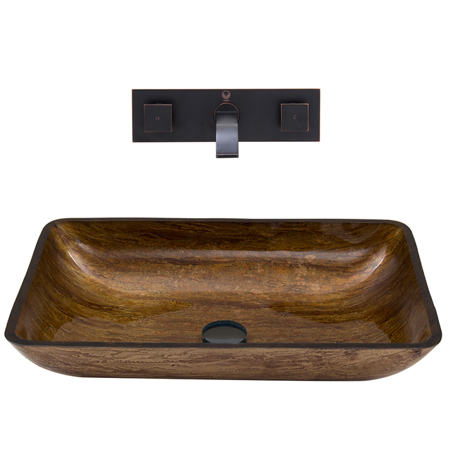 The VIGO Rectangular Amber Sunset glass sink set with Antique Rubbed Bronze wall mount faucet brings luxury and elegance to your bathroom.