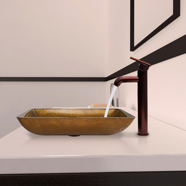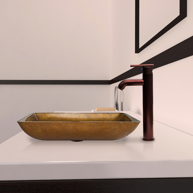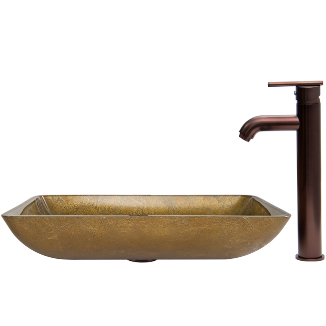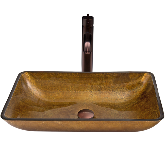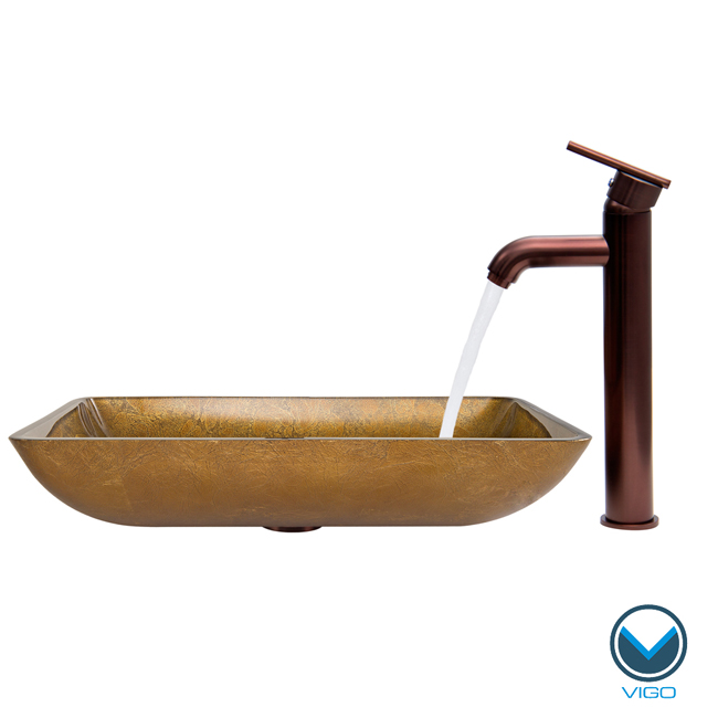 The VIGO Rectangular Copper glass vessel sink and Seville faucet set in Oil Rubbed Bronze is a classic and timeless addition to the bathroom.
