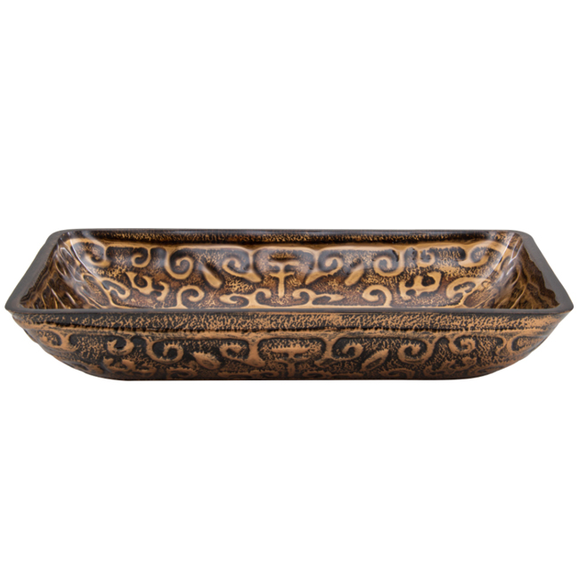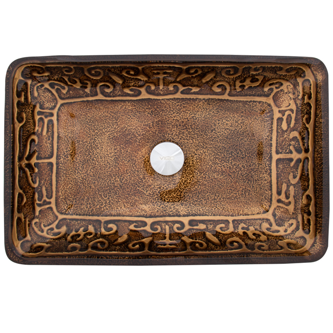 The VIGO Rectangular Golden Greek glass vessel sink features an exotic