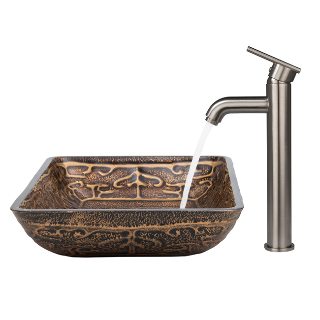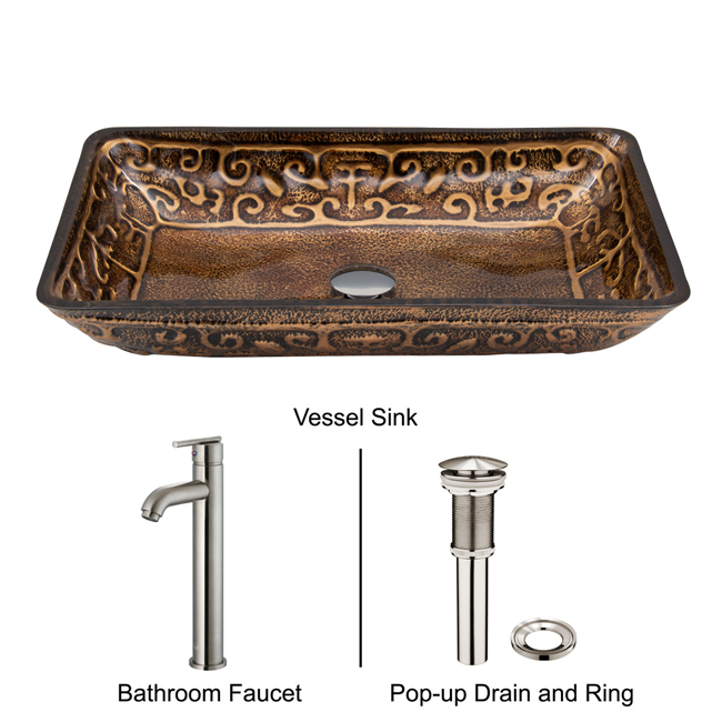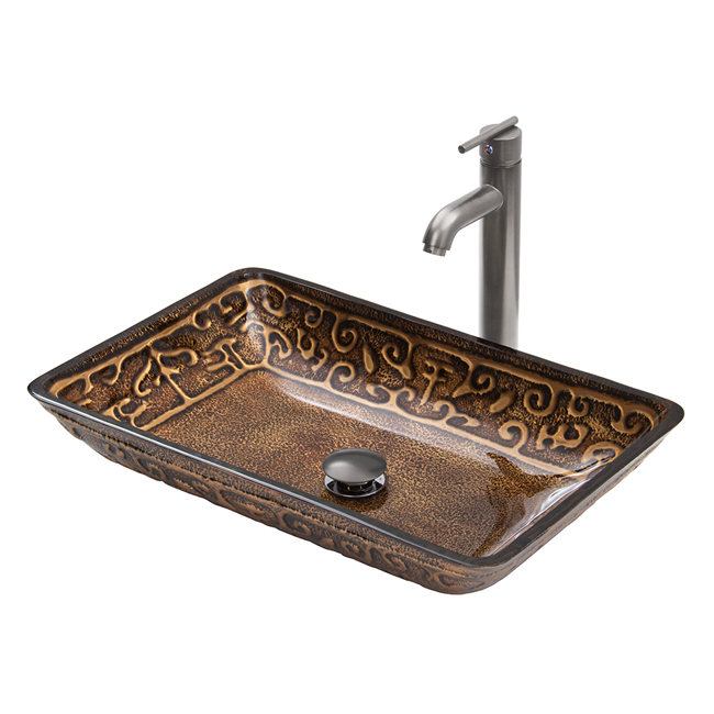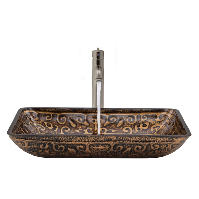 The VG07045 glass vessel sink features an exotic gold colored artistic design, combined with a rich, dark brown color.
