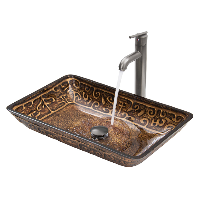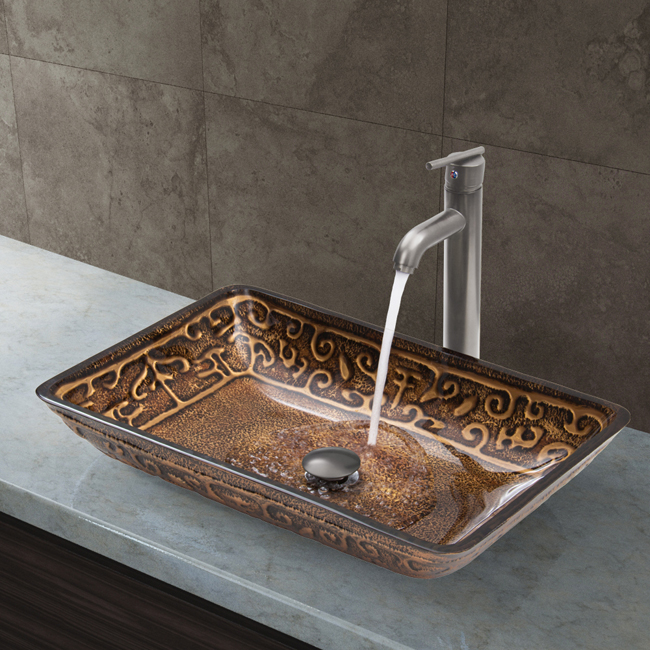 The VIGO Rectangular Golden Greek glass vessel sink set with Brushed Nickel faucet will become a true beauty in any home.