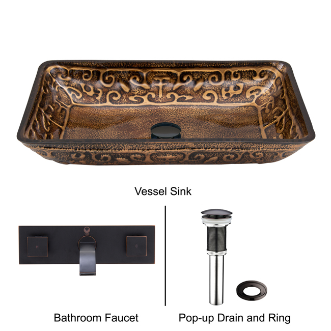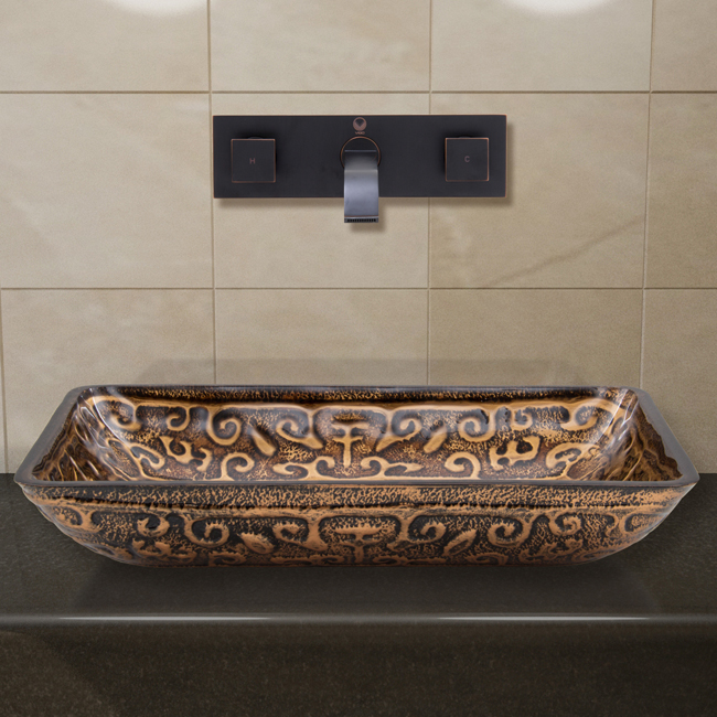 The VG07045 glass vessel sink features an exotic gold colored artistic design, combined with a rich, dark brown color.