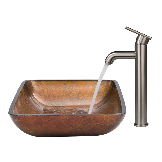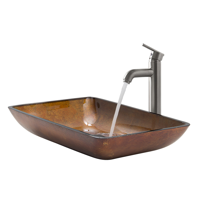 The VIGO Rectangular Russet glass vessel sink set with Brushed Nickel faucet is modern and intriguing.