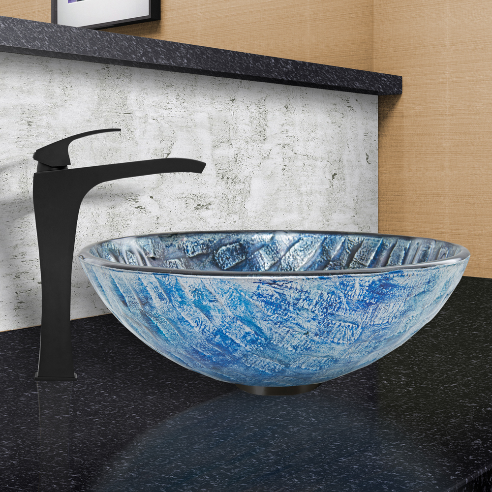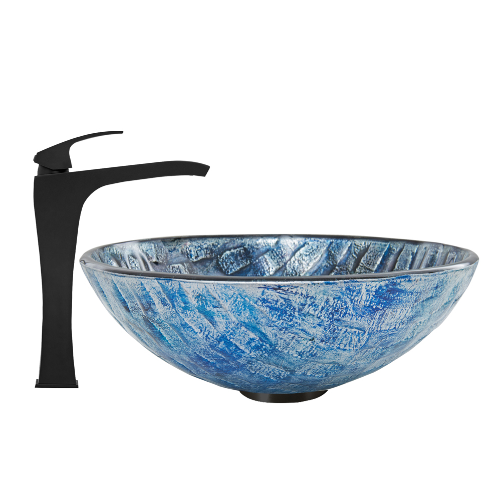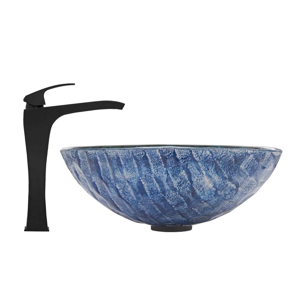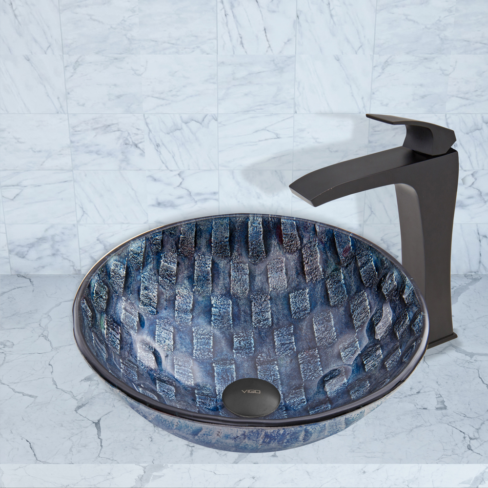 The VG07056 Rio glass vessel bowl features the gorgeous weave of blue and purple tones, giving it a unique appearance, and resembling the bottom of a river.