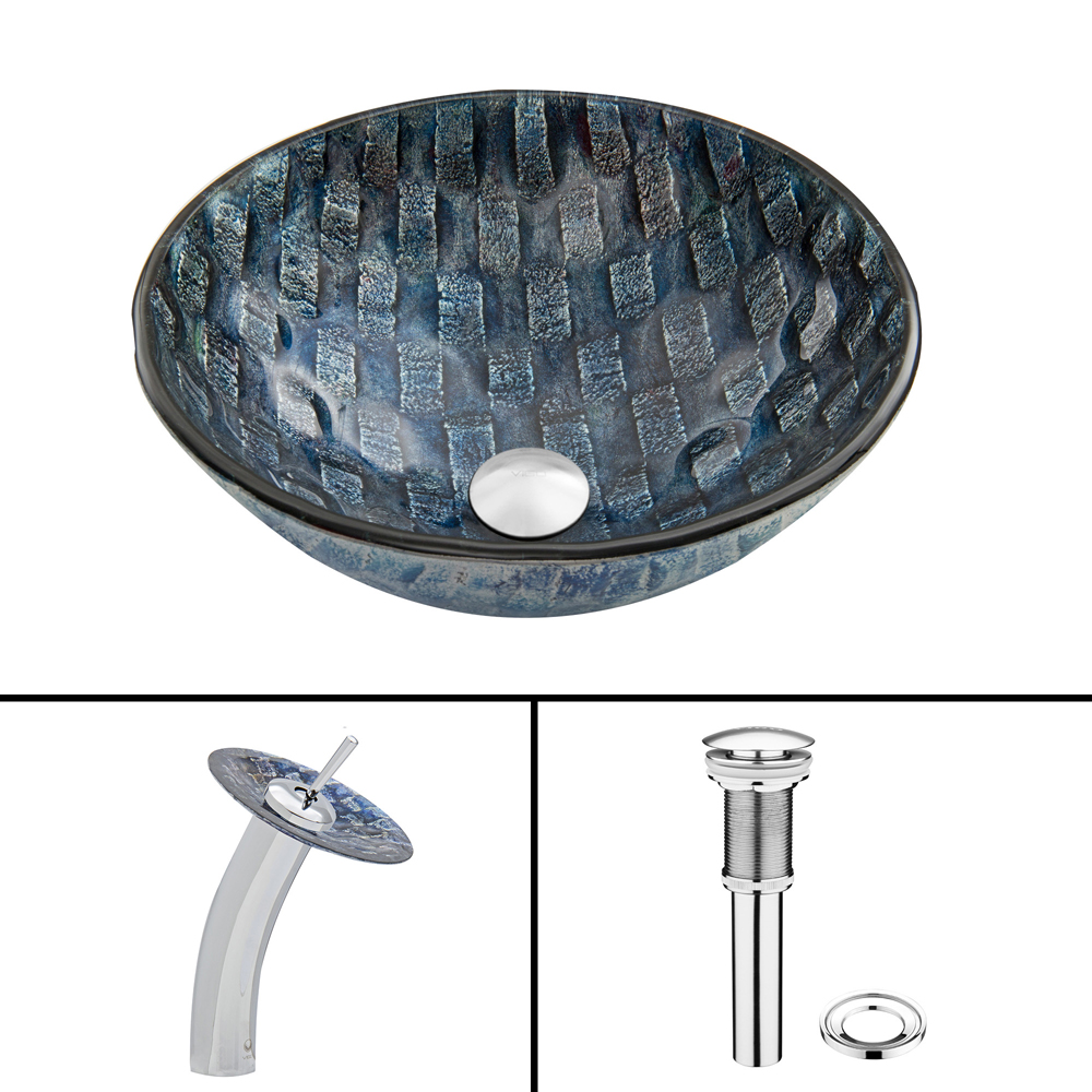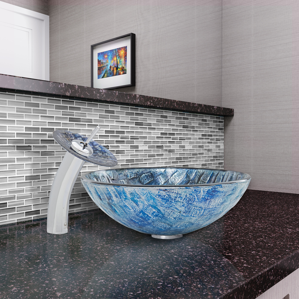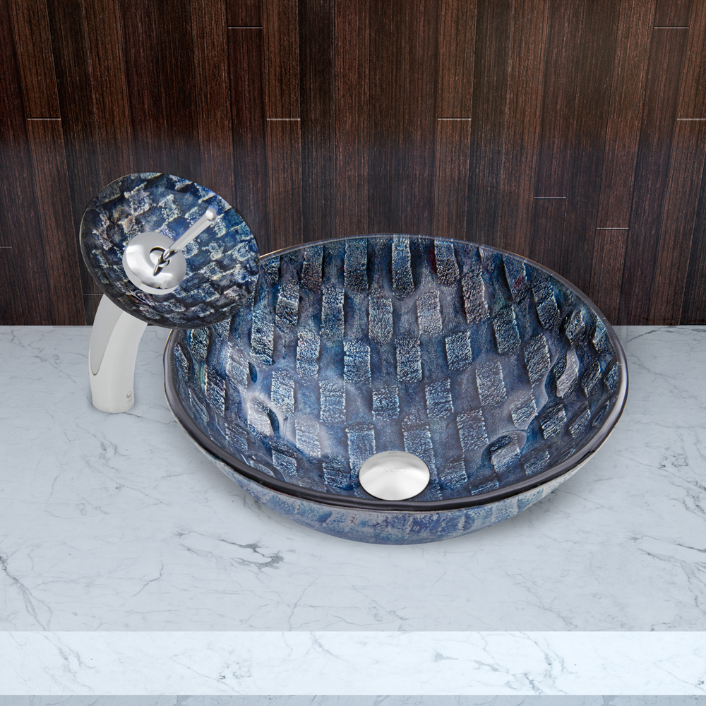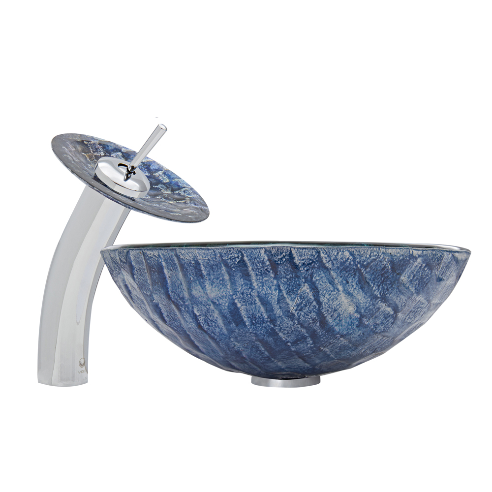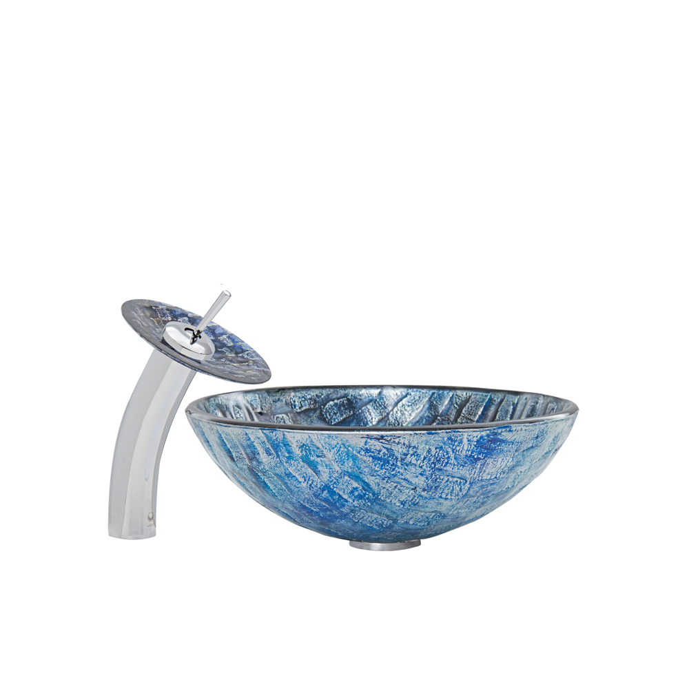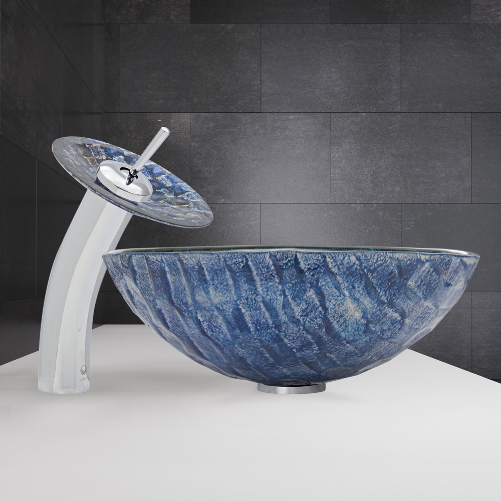 Imagine the bottom of the bluest river. That river is captured in the VIGO Rio vessel sink and matching waterfall faucet in chrome. The gorgeous weave of blues and purples give this vessel sink a unique appearance.