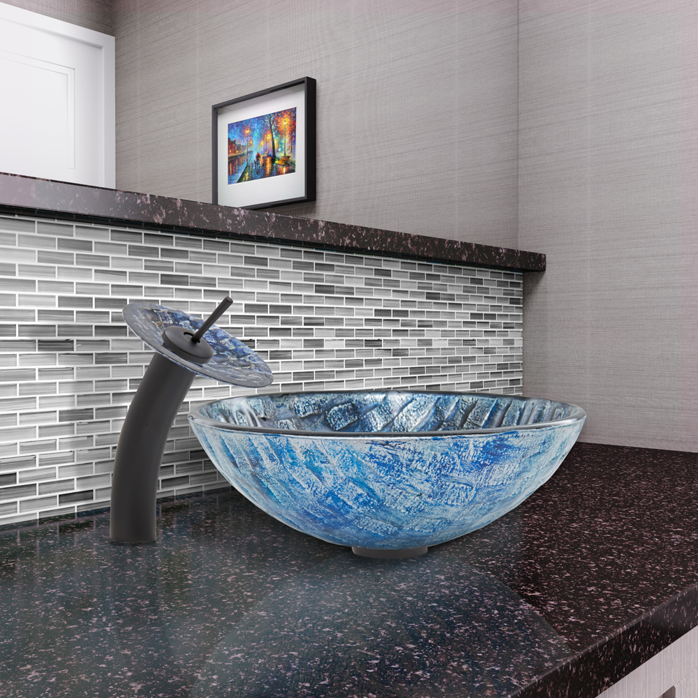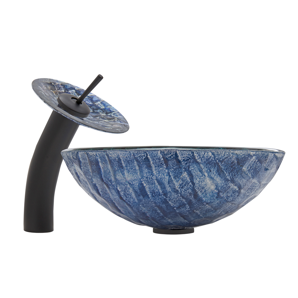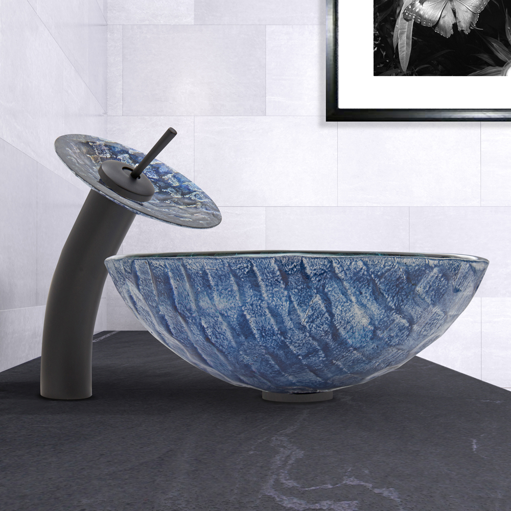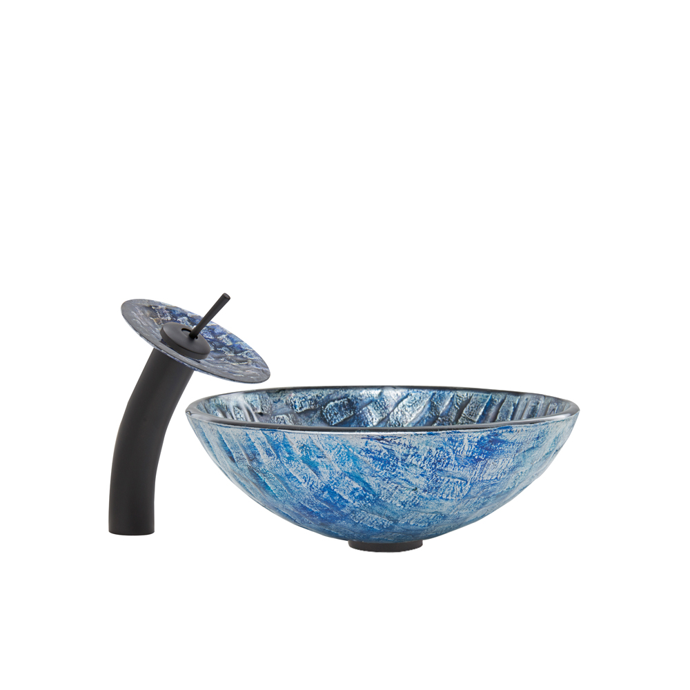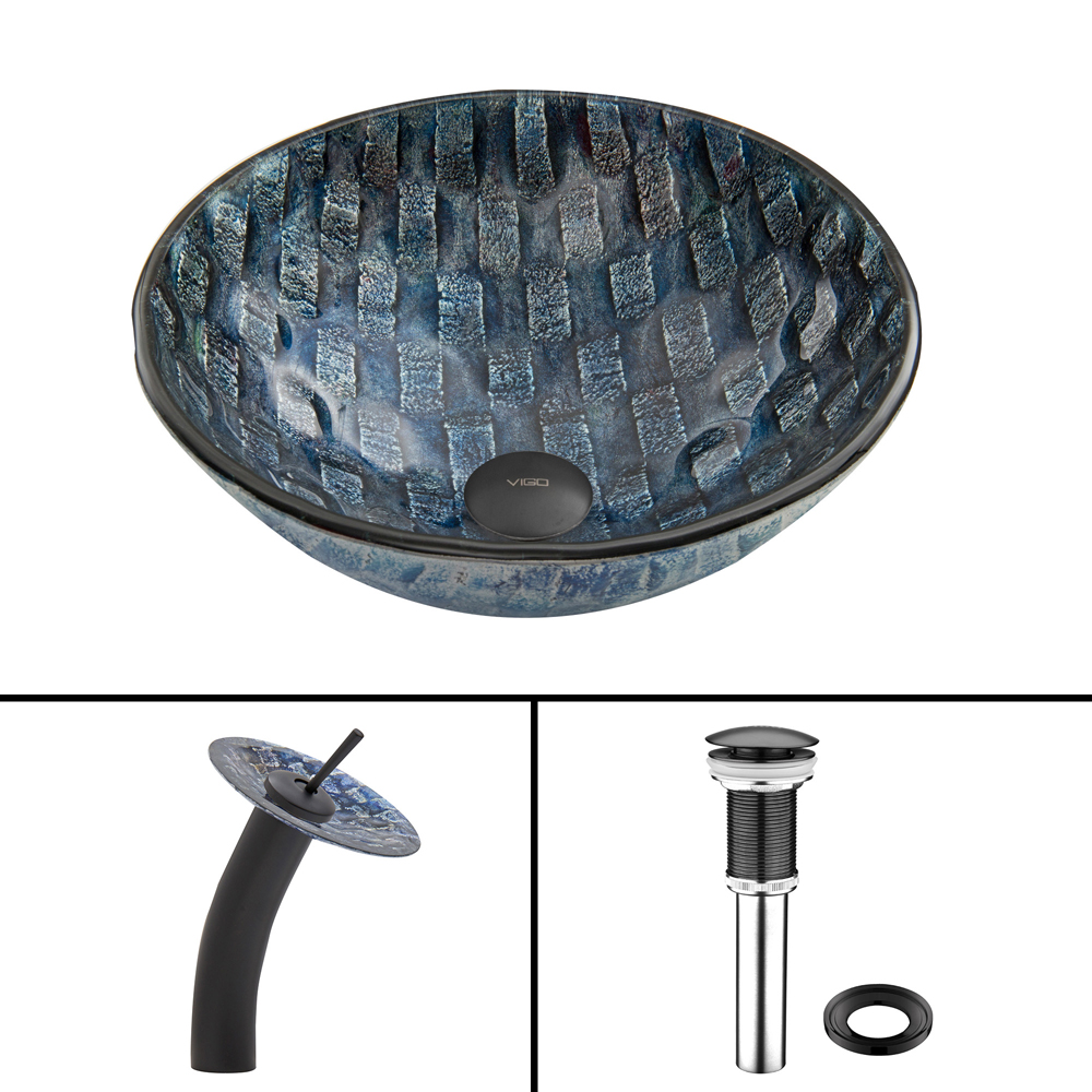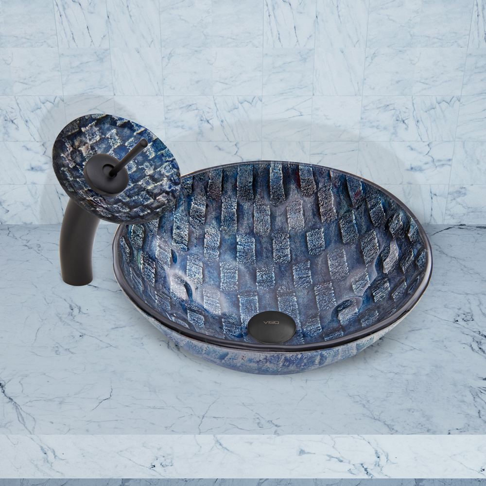 Imagine the bottom of the bluest river. That river is captured in the VIGO Rio vessel sink and matching waterfall faucet in matte black. The gorgeous weave of blues and purples give this vessel sink a unique appearance.