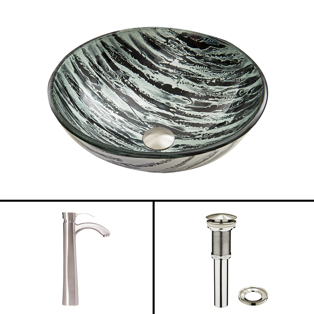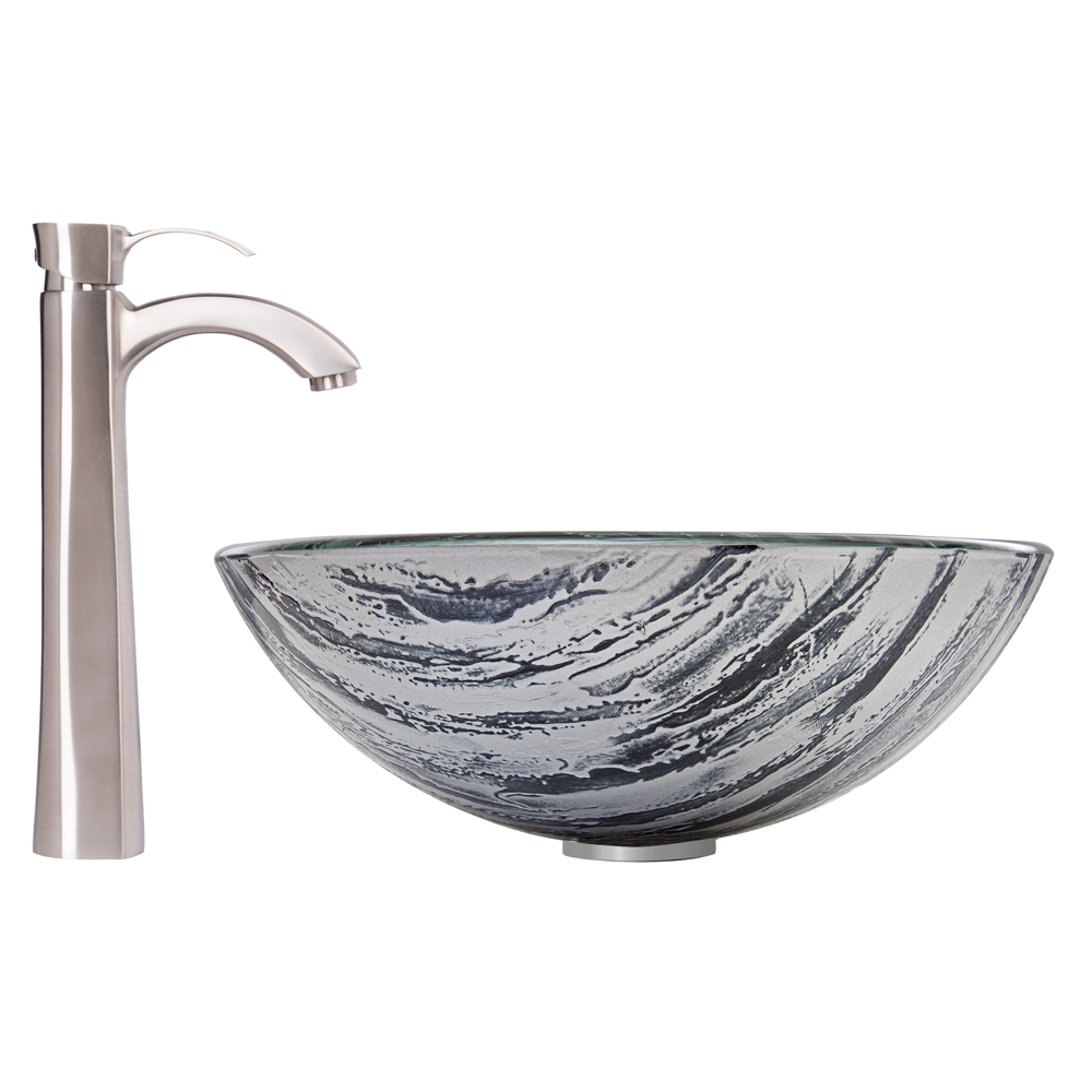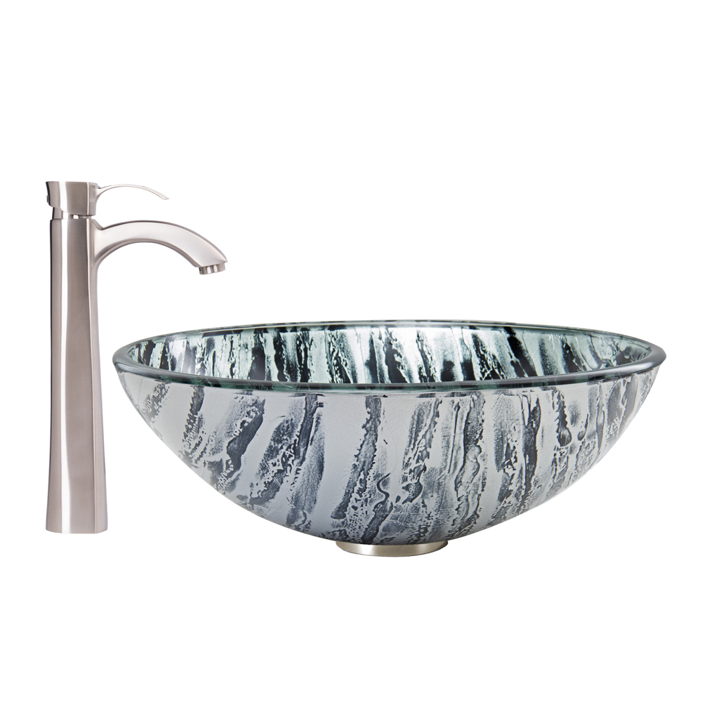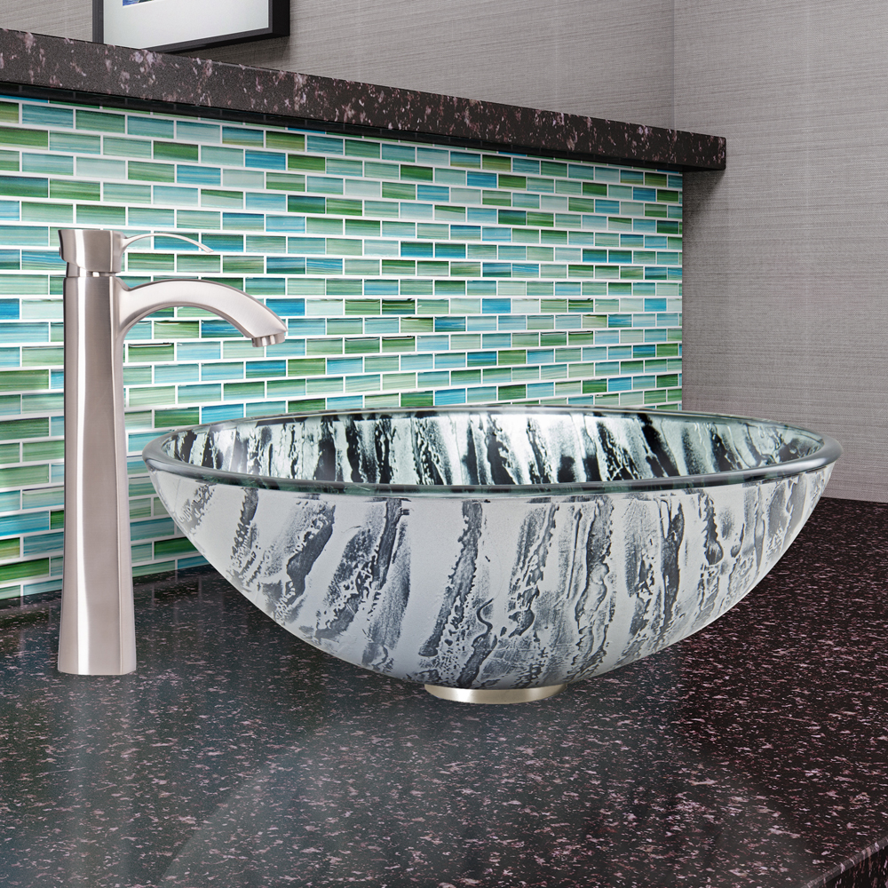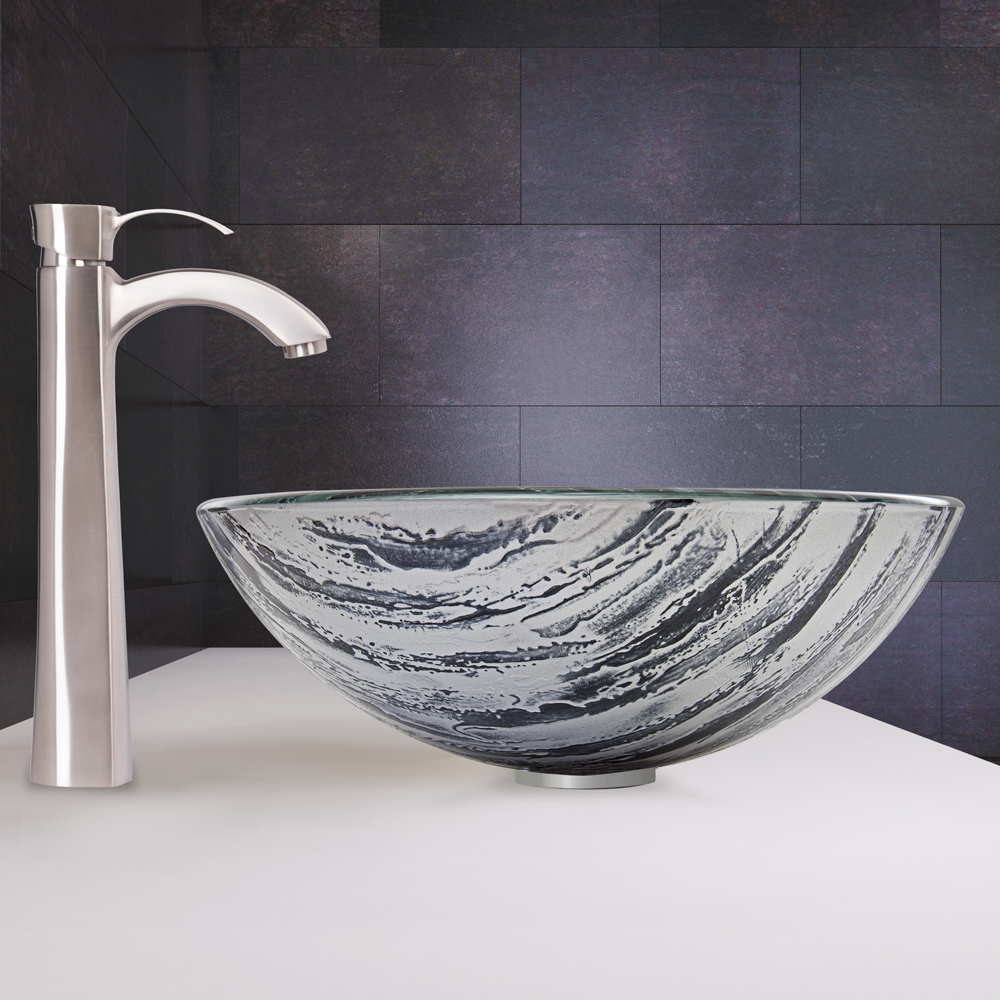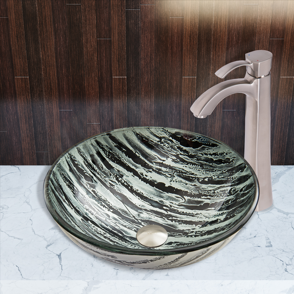 The VIGO Rising Moon Glass Vessel Sink and Otis Faucet Set in Brushed Nickel Finish is bold and beautiful, sure to wake up the night.