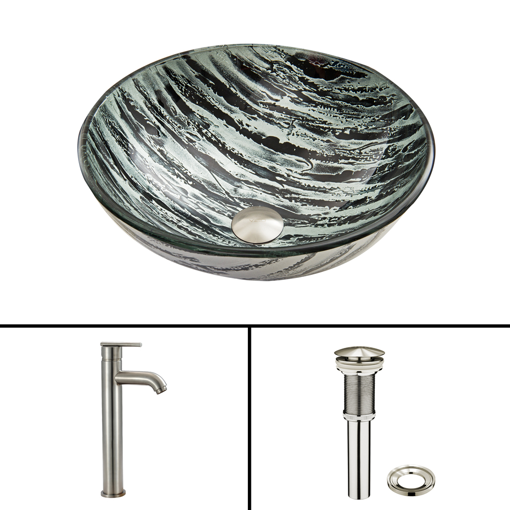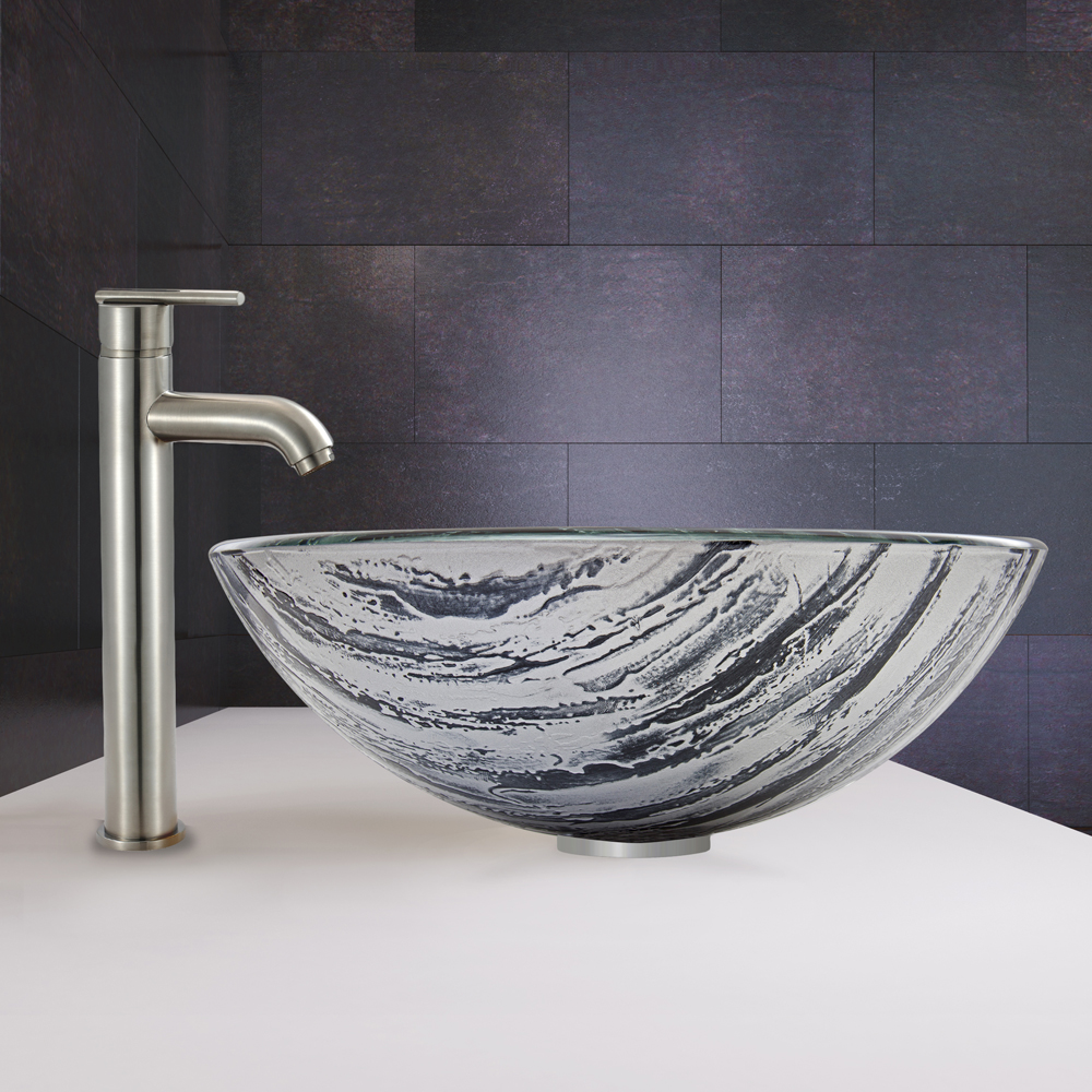 The VG07052 Rising Moon glass vessel sink features stripes of black and white, resembling a full moon glowing through the branches of a tall tree.