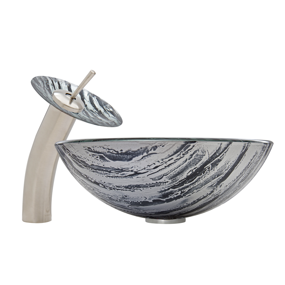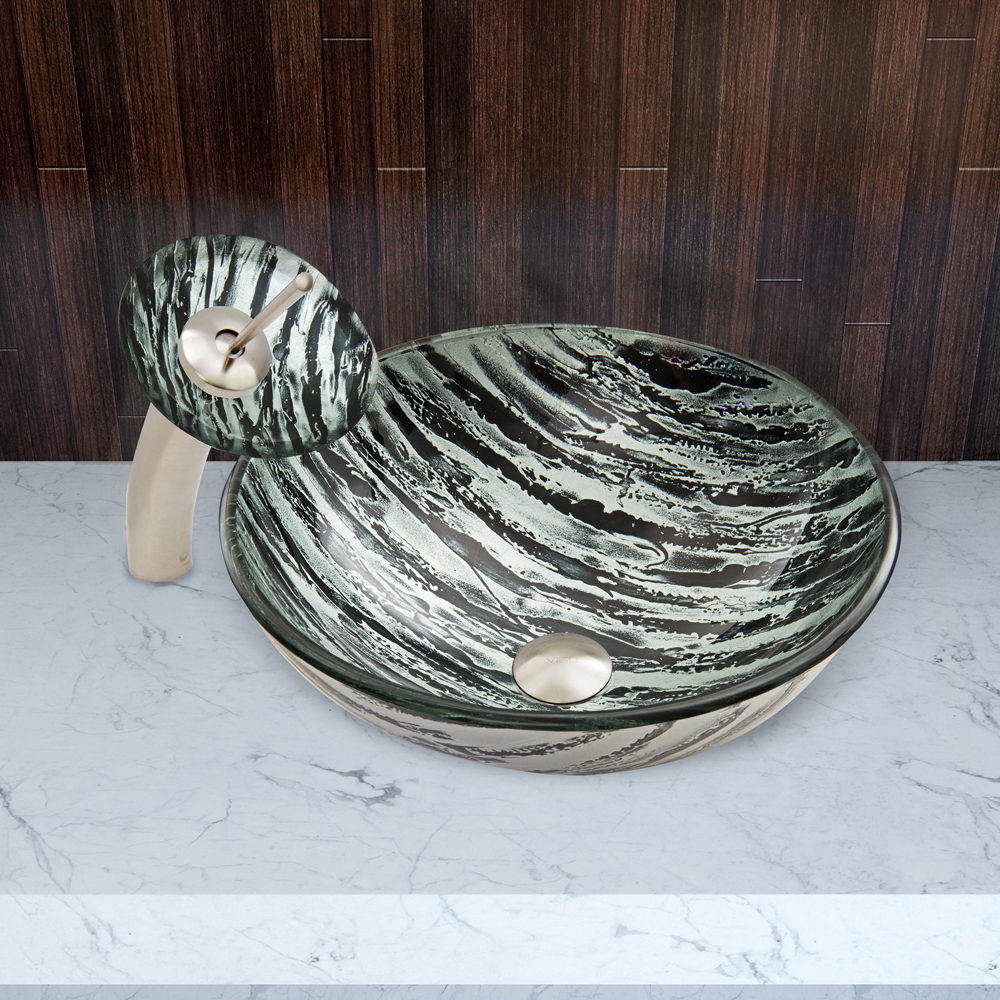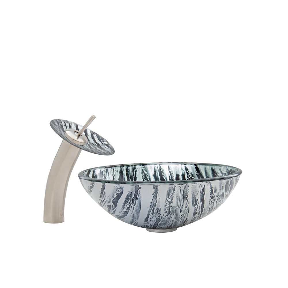 Wake up the night with the VIGO Rising Moon vessel sink and matching waterfall faucet in brushed nickel. The shining black and white stripes resemble a full moon glowing through the branches of a tall tree.