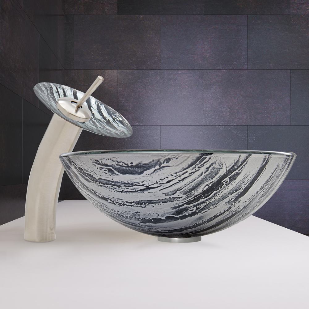 The VIGO Rising Moon Glass Vessel Sink and Waterfall Faucet Set in Brushed Nickel Finish is bold and beautiful, sure to wake up the night.