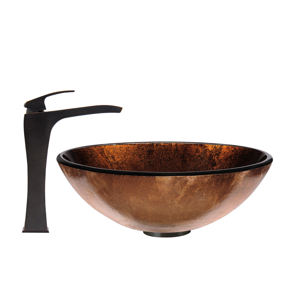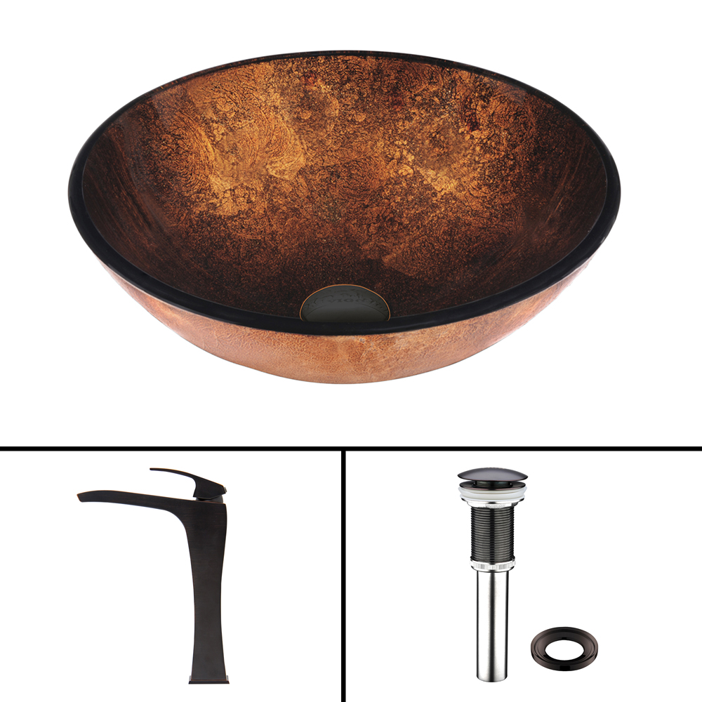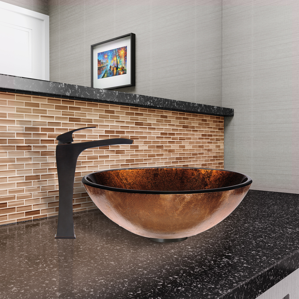 The VIGO Russet Glass Vessel Sink and Blackstonian Faucet Set in Antique Rubbed Bronze Finish is exactly what your new bathroom is missing.