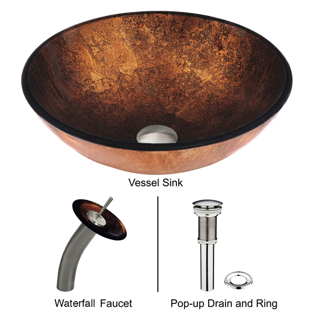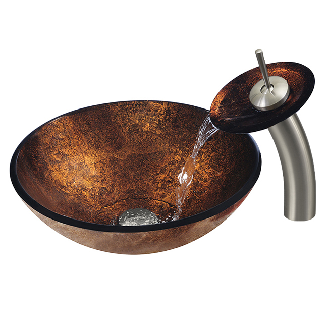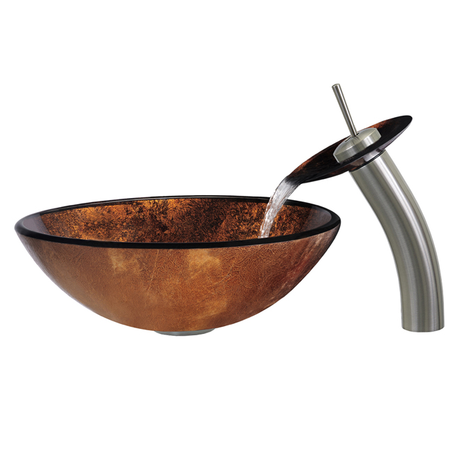 The VIGO Russet glass vessel sink and waterfall faucet set brings