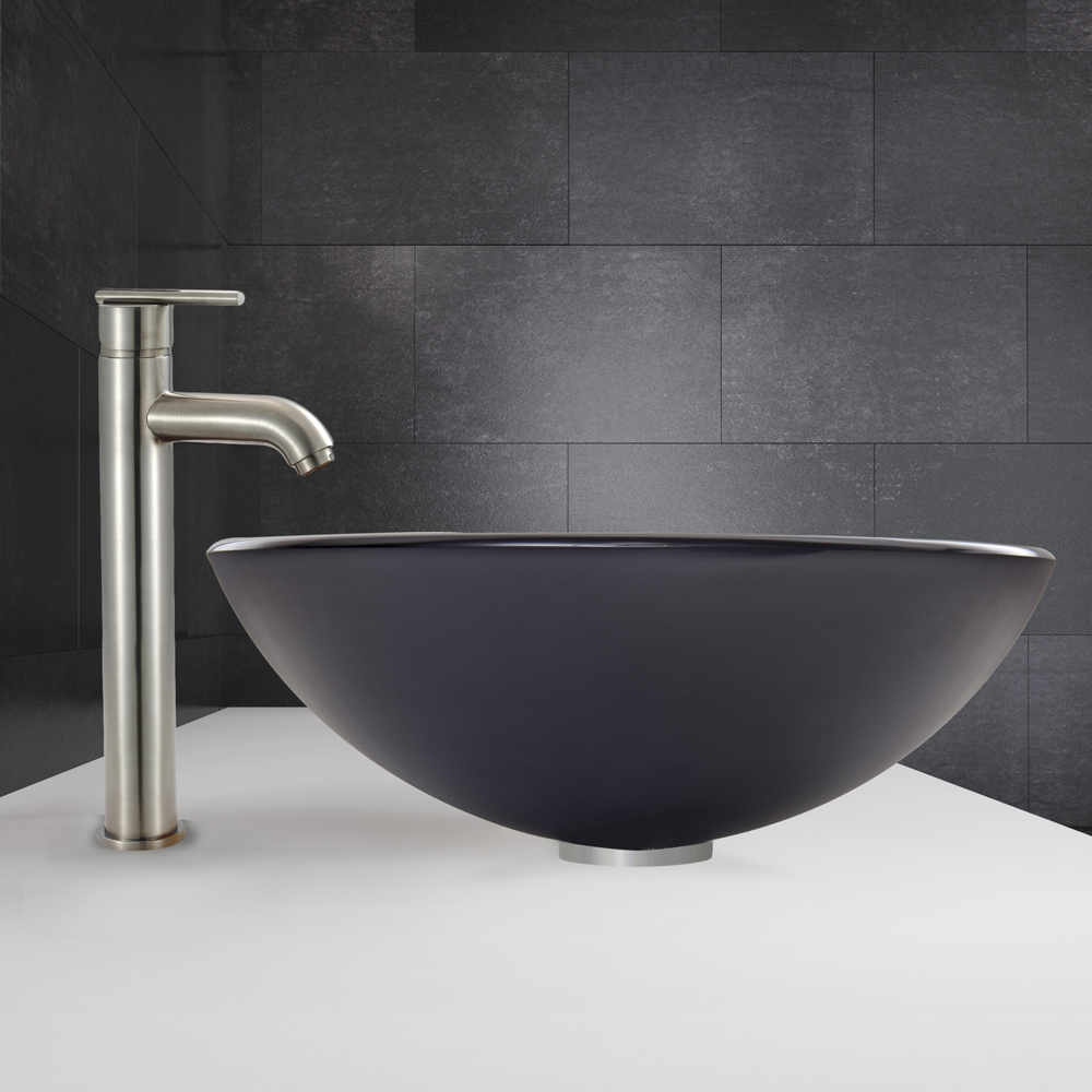 The VIGO Sheer Black Frost Glass Vessel Sink and Seville Faucet Set in a Brushed Nickel Finish will create a clean and modern, yet smooth and sleek addition to your bathroom.