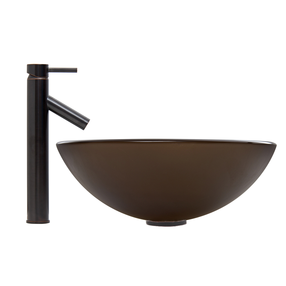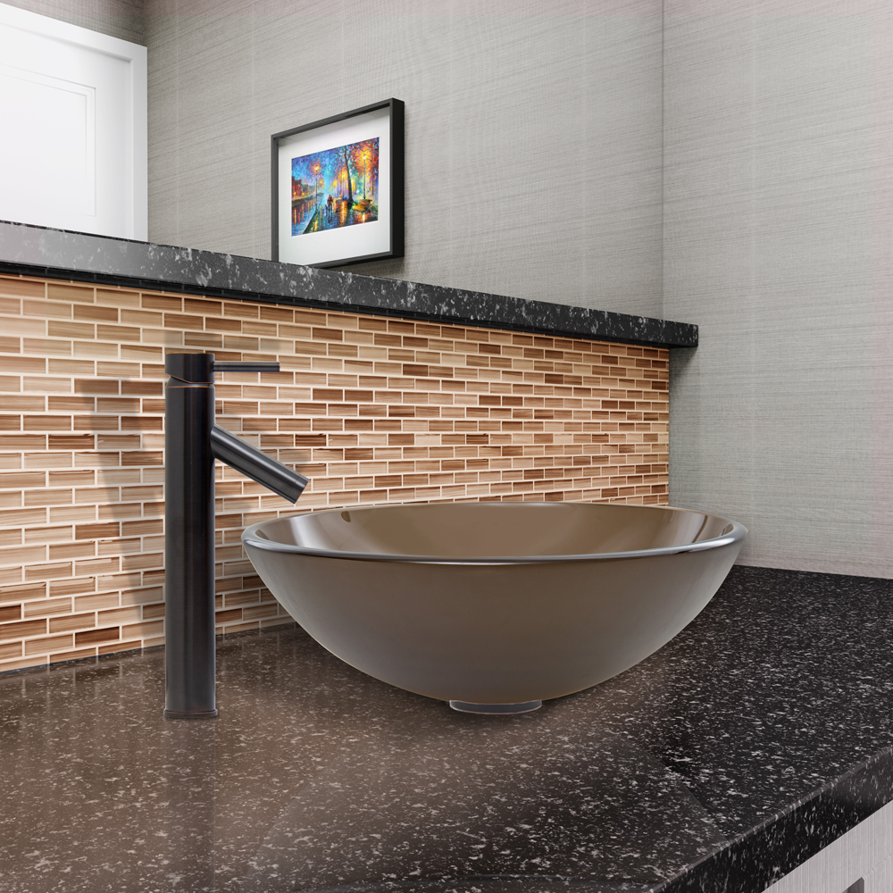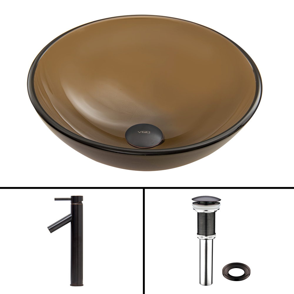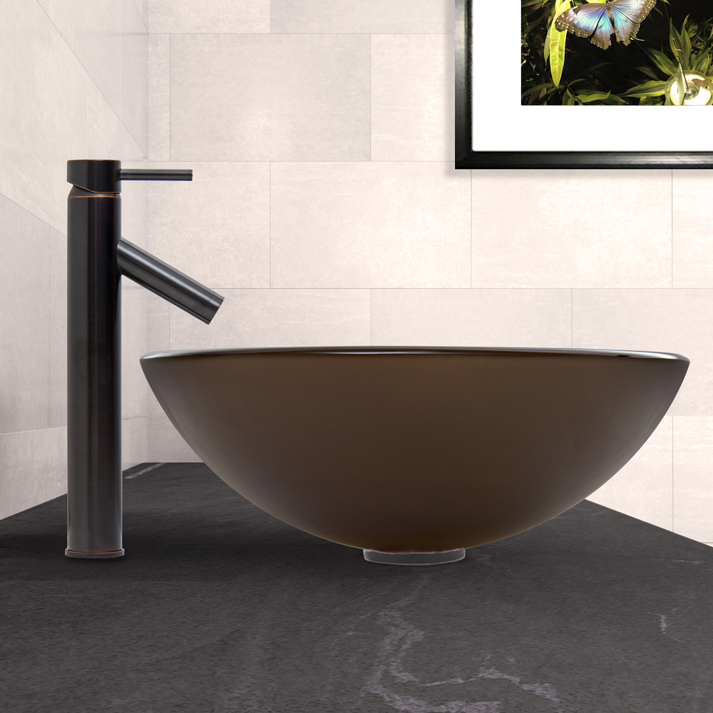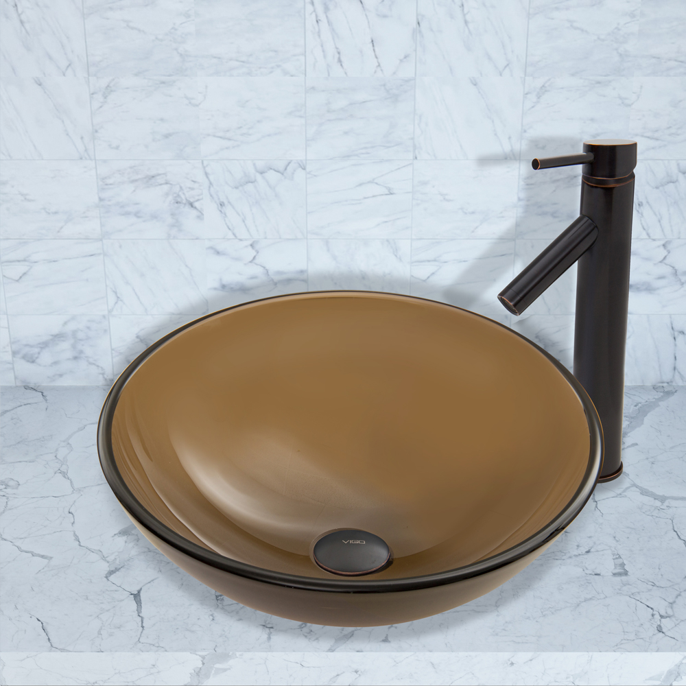 The VIGO Sheer Sepia Frosted Glass Vessel Sink and Dior Faucet Set in Antique Rubbed Bronze Finish adds a sophisticated touch of elegance to your bathroom.