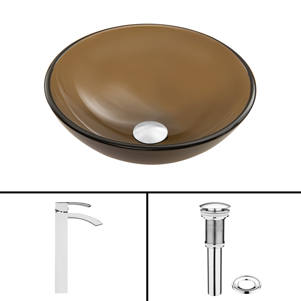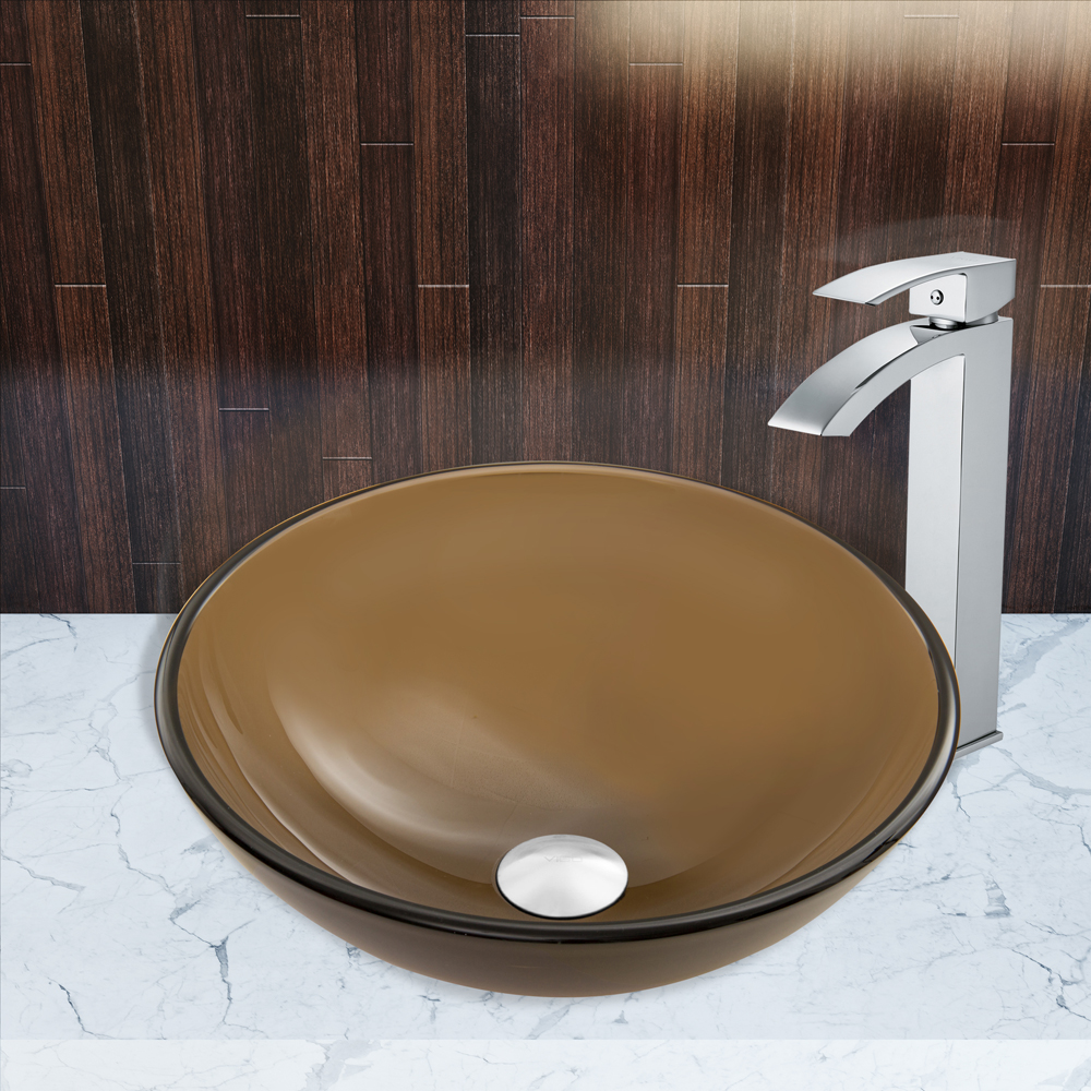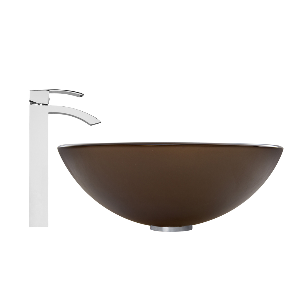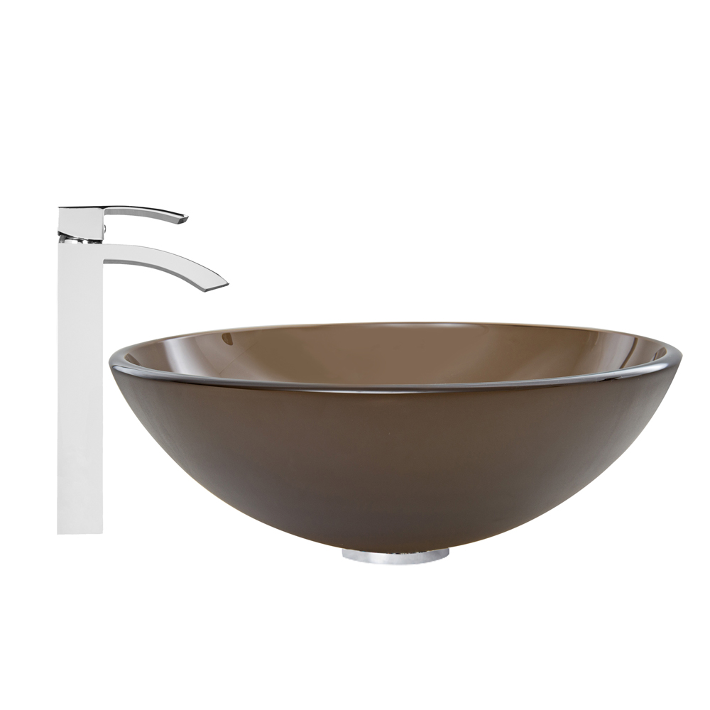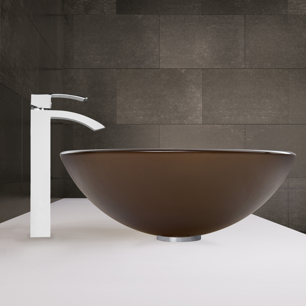 The VIGO Sheer Sepia Frosted Glass Vessel Sink and Duris Faucet Set in Chrome Finish will create a clean and modern, yet smooth and sleek addition to your bathroom.