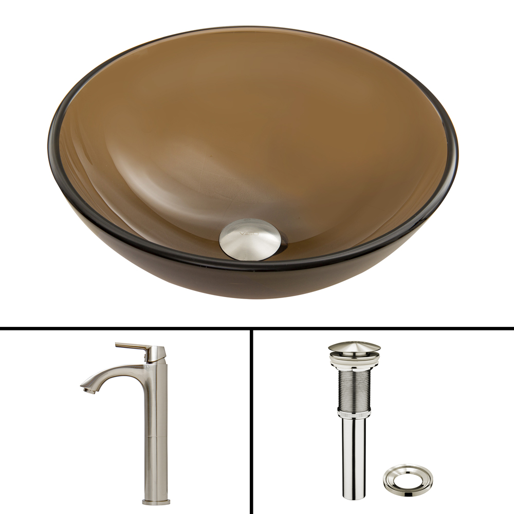 The VIGO Sheer Sepia Frosted Glass Vessel Sink and Linus Faucet Set in Brushed Nickel Finish adds a sophisticated touch of elegance to your bathroom.