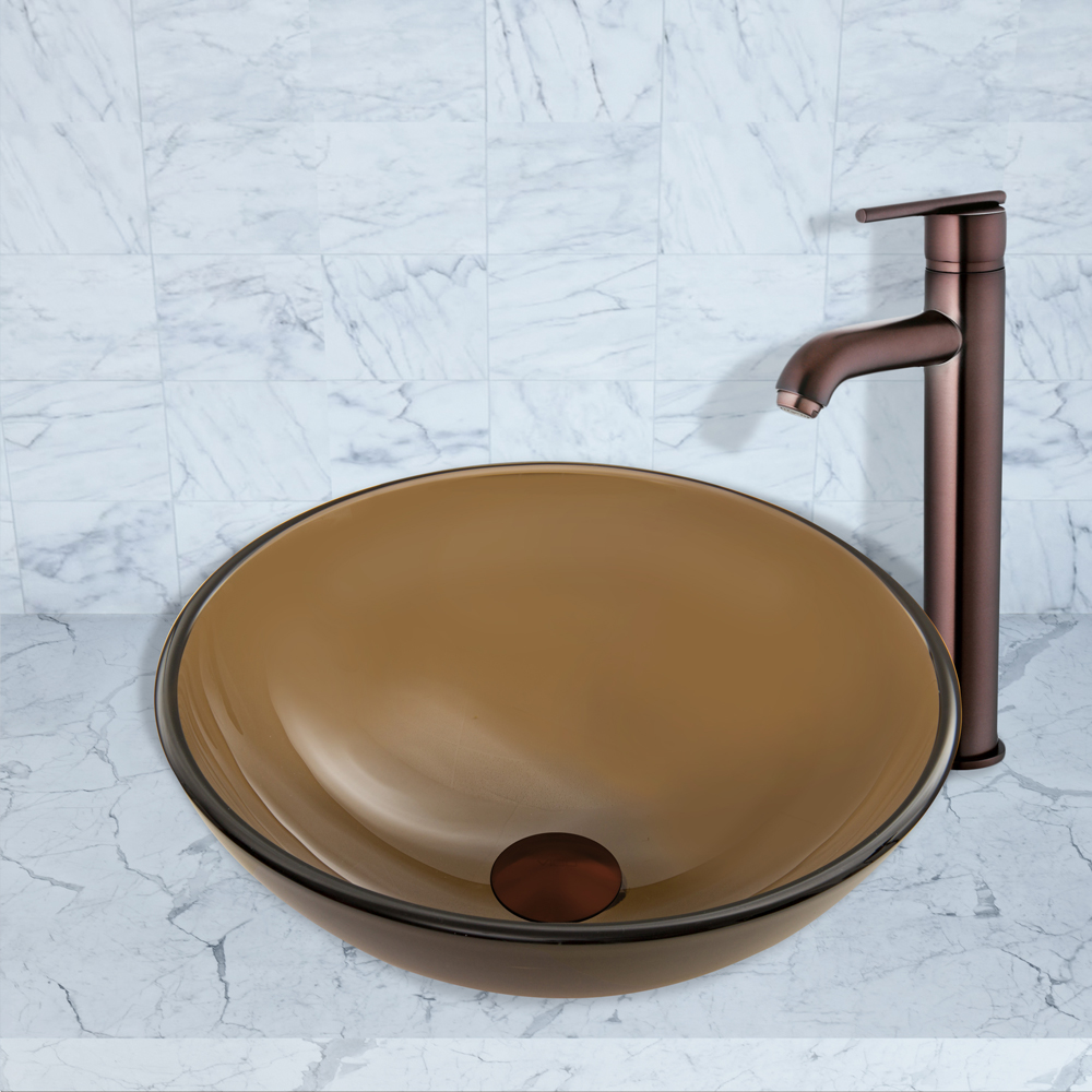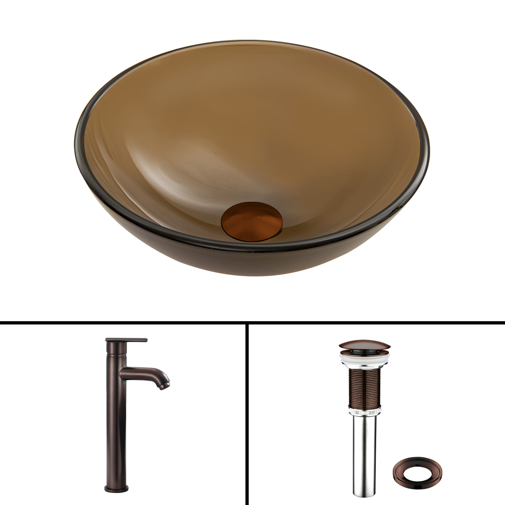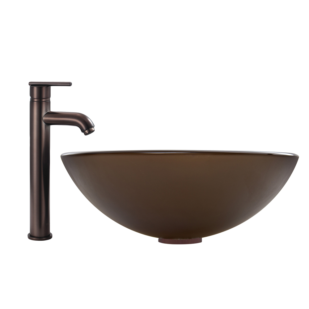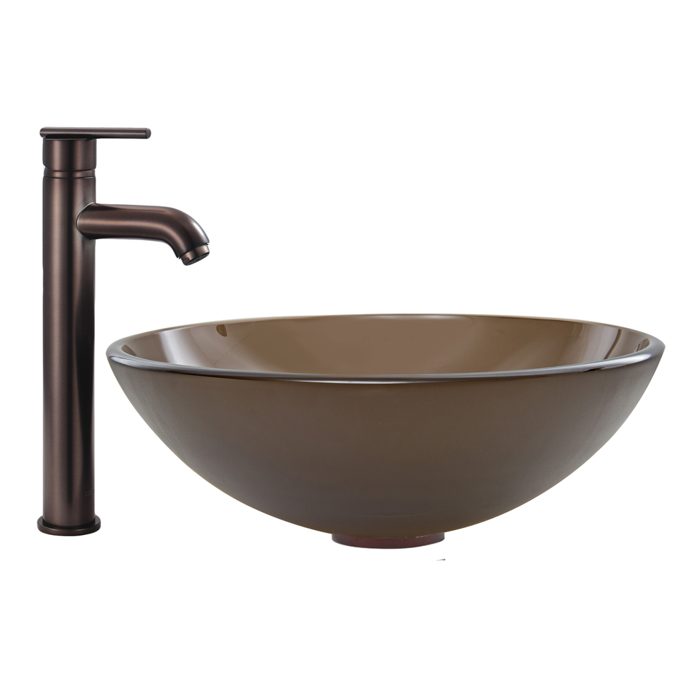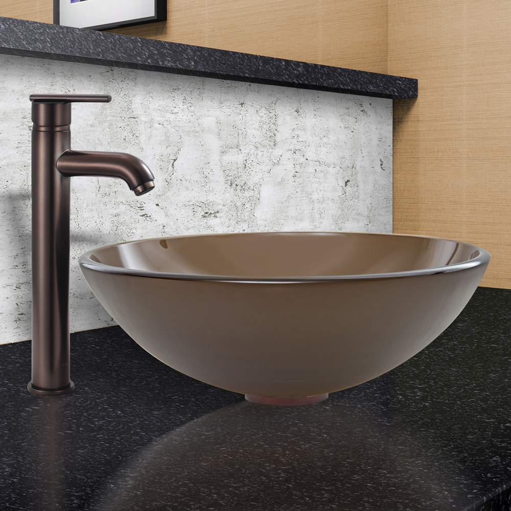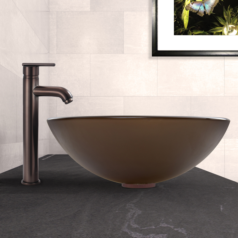 The VIGO Sheer Sepia Frosted Glass Vessel Sink and Seville Faucet Set in Oil Rubbed Bronze Finish will create a clean and modern, yet smooth and sleek addition to your bathroom.