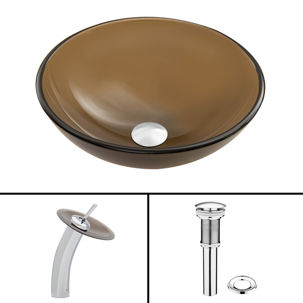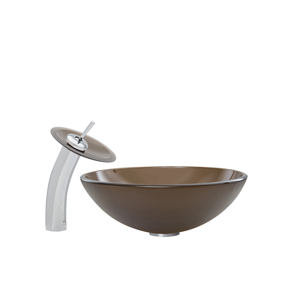 The VIGO Sheer Sepia glass vessel sink and matching waterfall faucet in chrome is a clean shadow on the counter of your bathroom. The transparent brown glass is smooth and frosted, but still allows reflections to bounce off it's surface.
