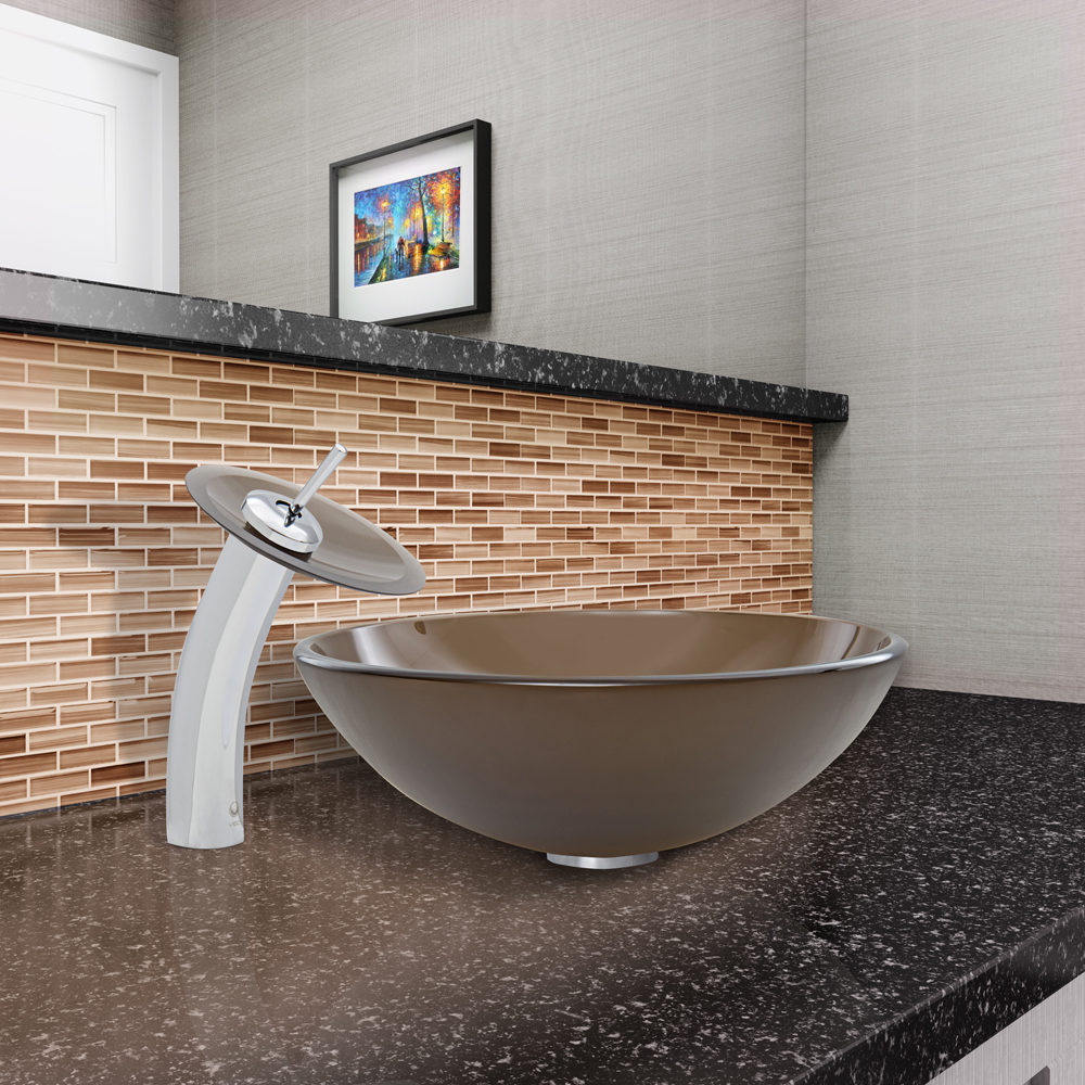 The VIGO Sheer Sepia frosted Glass Vessel Sink and Waterfall Faucet Set in Chrome Finish adds a sophisticated touch of elegance to your bathroom.