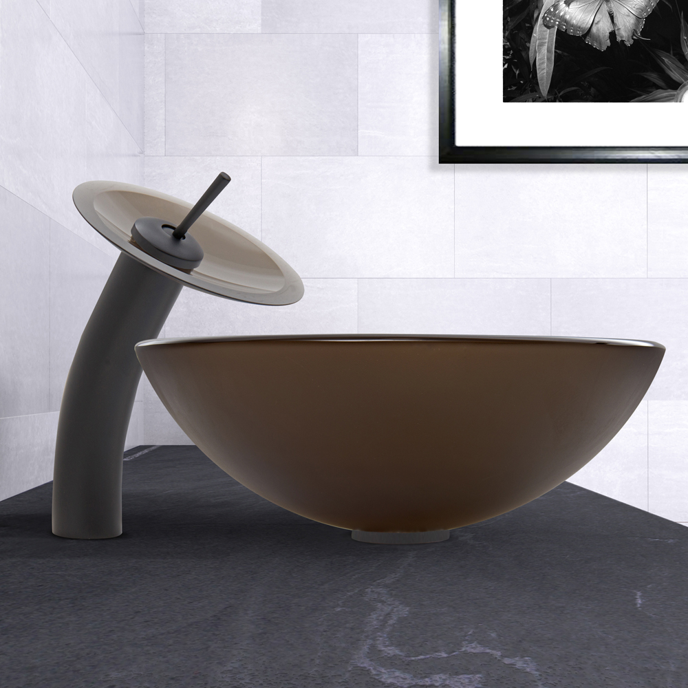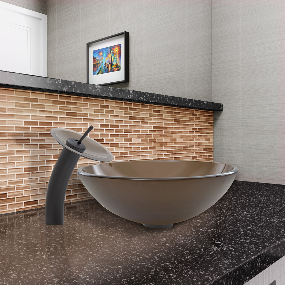 The VIGO Sheer Sepia frosted Glass Vessel Sink and Waterfall Faucet Set in Matte Black Finish adds a sophisticated touch of elegance to your bathroom.