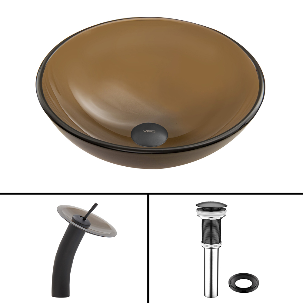 The VIGO Sheer Sepia glass vessel sink and matching waterfall faucet in matte black is a clean shadow on the counter of your bathroom. The transparent brown glass is smooth and frosted, but still allows reflections to bounce off it's surface.