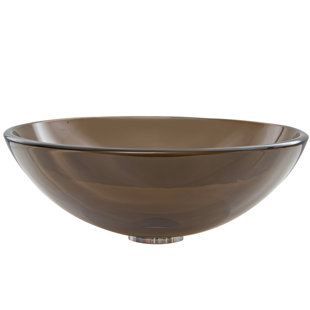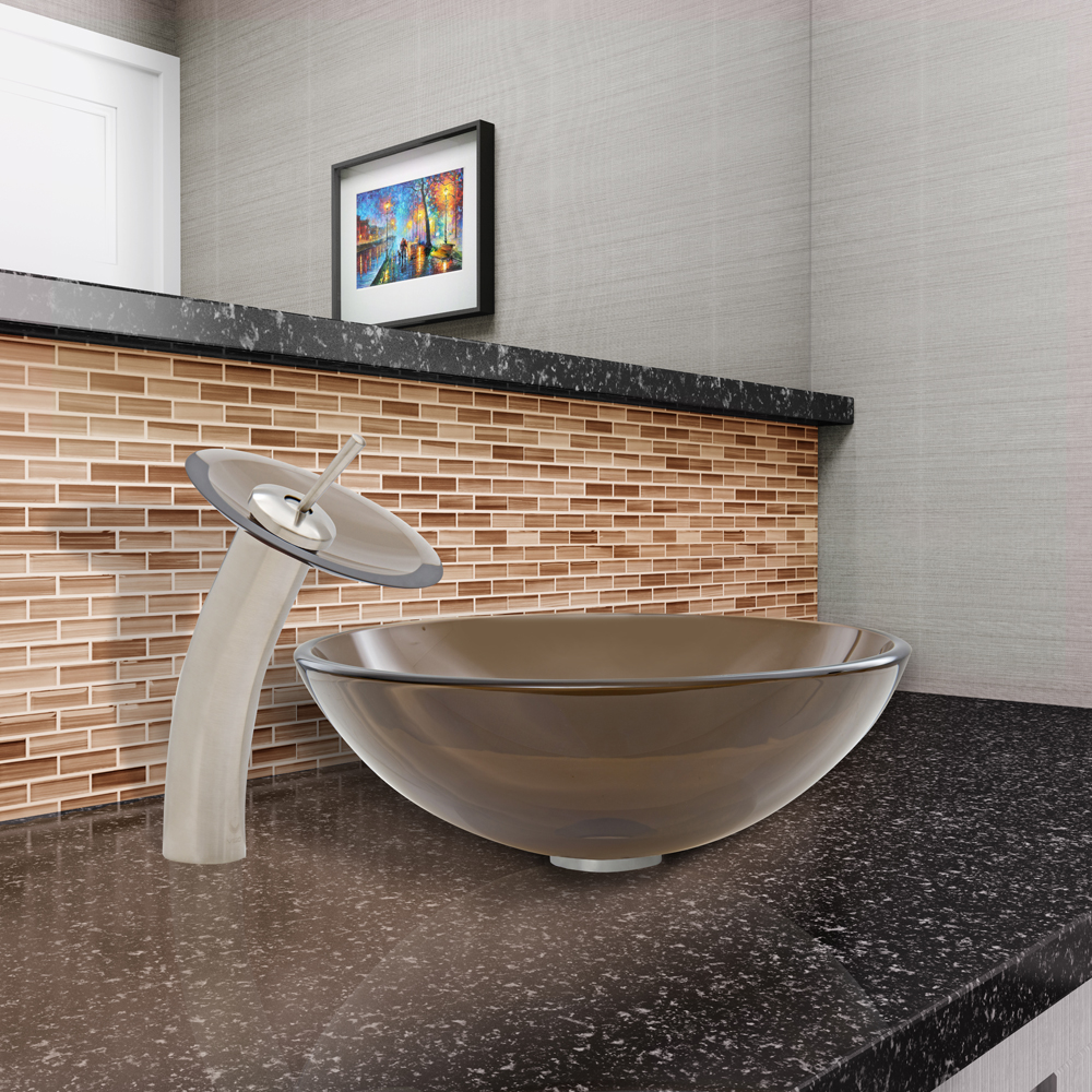 The VIGO Sheer Sepia glass vessel sink is a clean shadow on the counter of your bathroom. The transparent brown glass is smooth and sleek allowing reflections to bounce off it's surface.