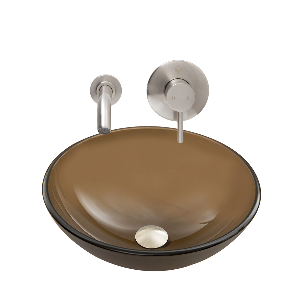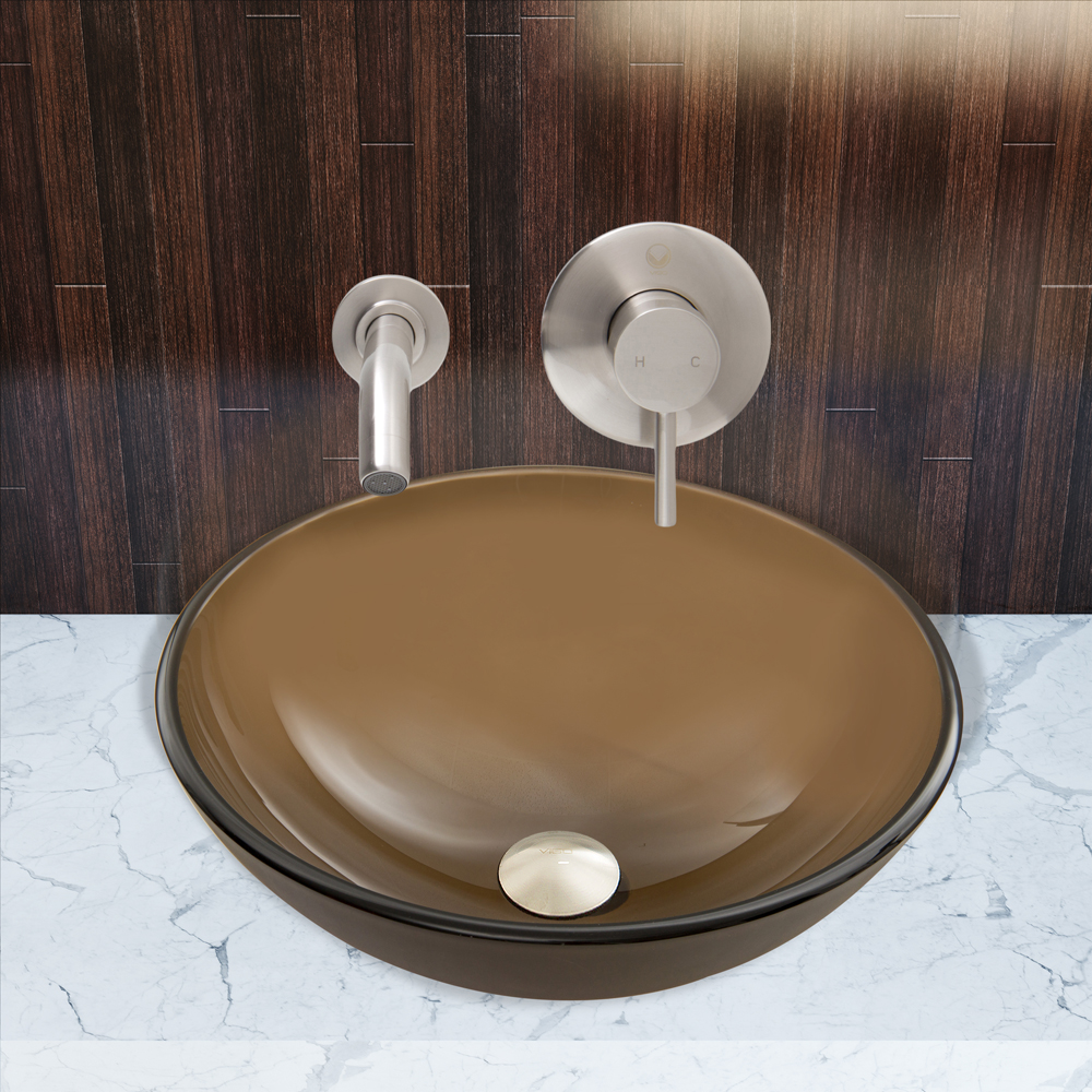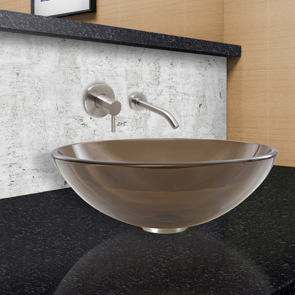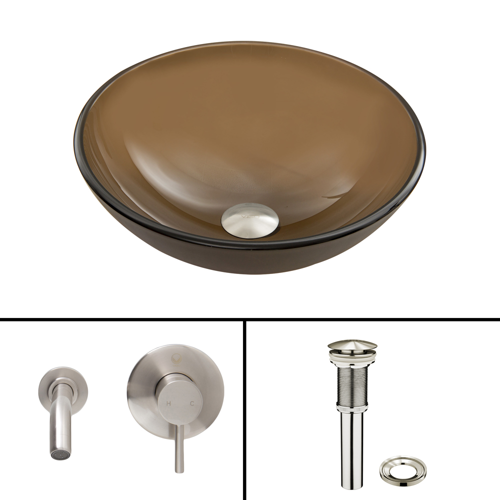 The VIGO Sheer Sepia Glass Vessel Sink and Olus Wall Mount Faucet Set in Brushed Nickel Finish will say a lot about your taste and style. You and Your friends are sure to love it!.