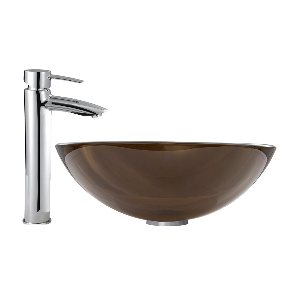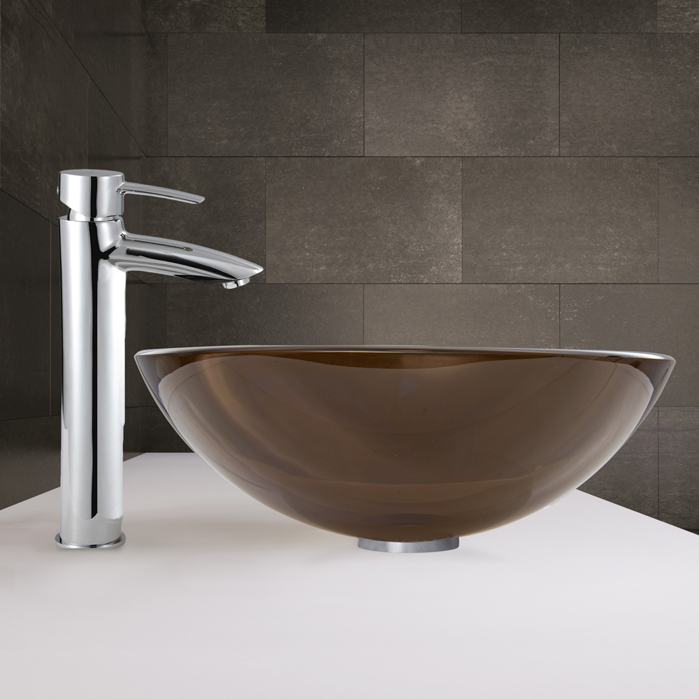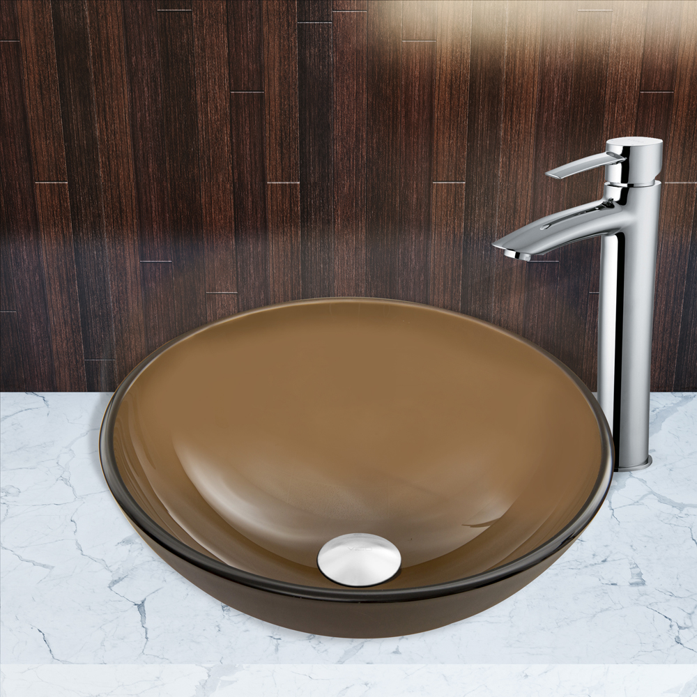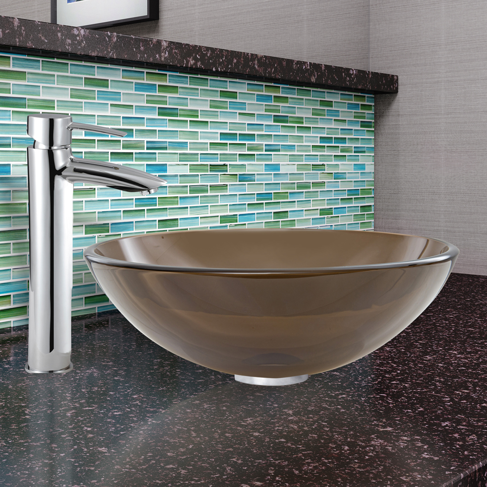 The VIGO Sheer Sepia Glass Vessel Sink and Shadow Faucet Set in Chrome Finish adds a sophisticated touch of elegance to your bathroom.