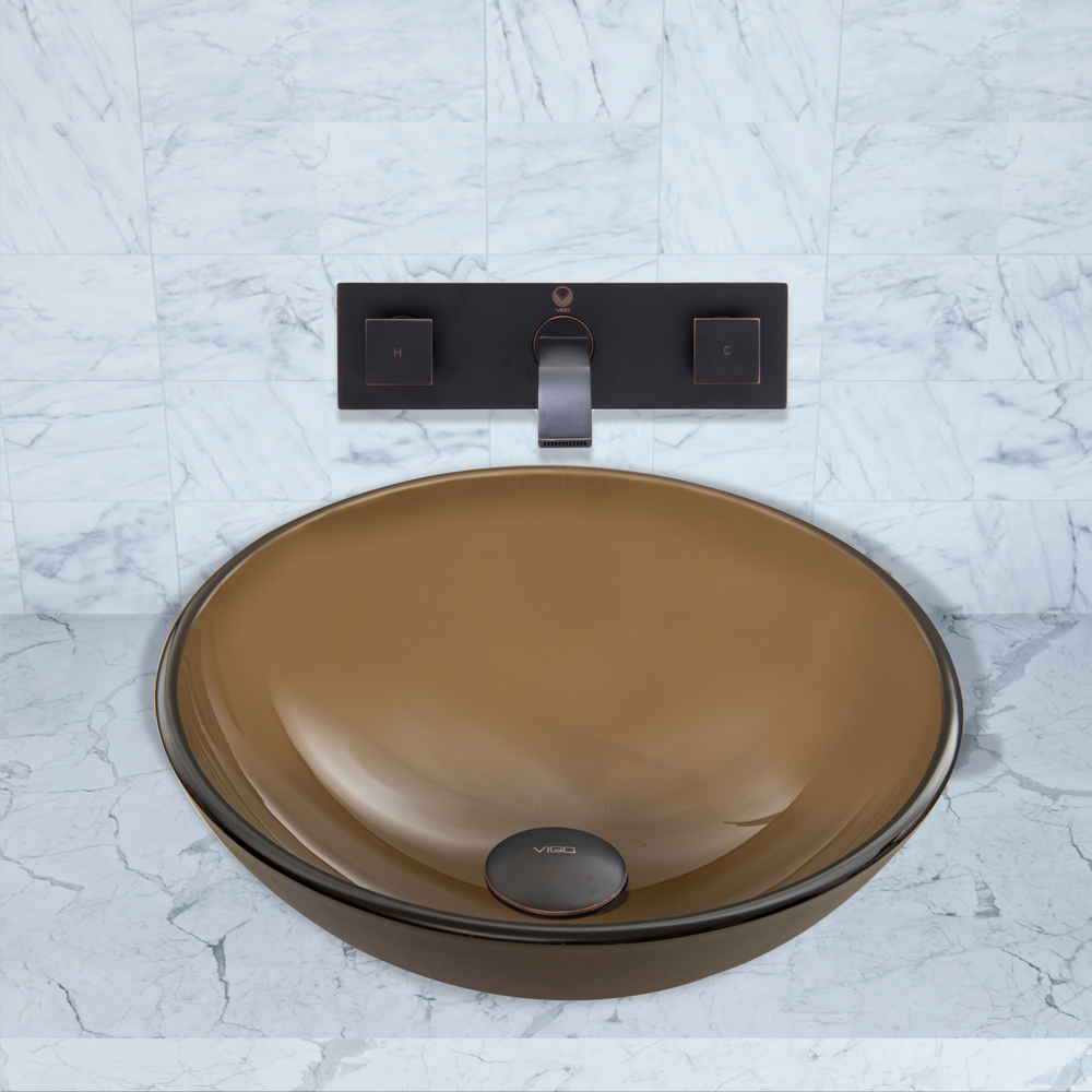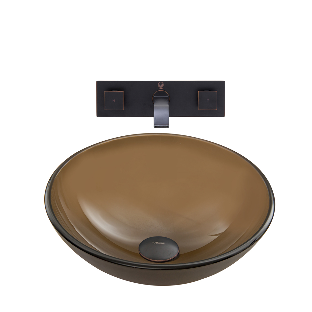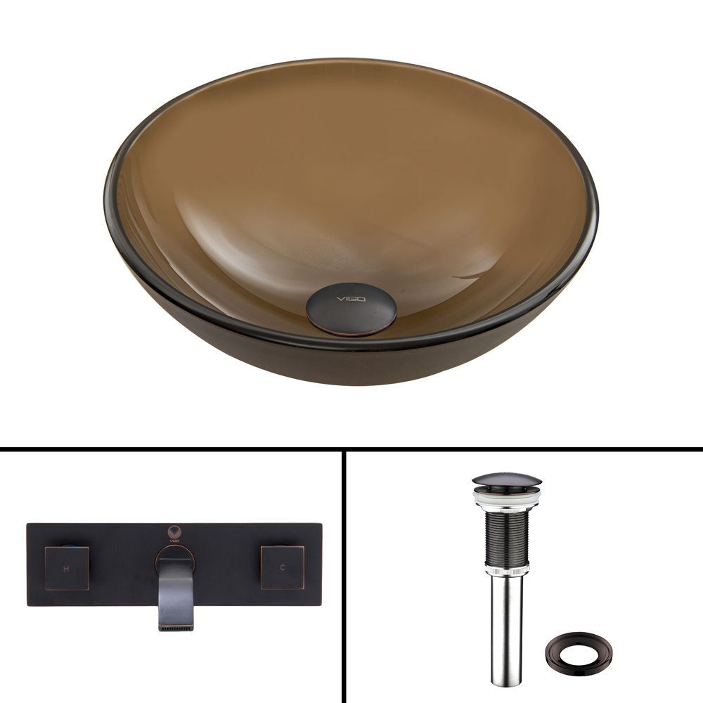 The VIGO Sheer Sepia Glass Vessel Sink and Titus Wall Mount Faucet Set in Antique Rubbed Bronze Finish will create a clean and modern, yet smooth and sleek addition to your bathroom.