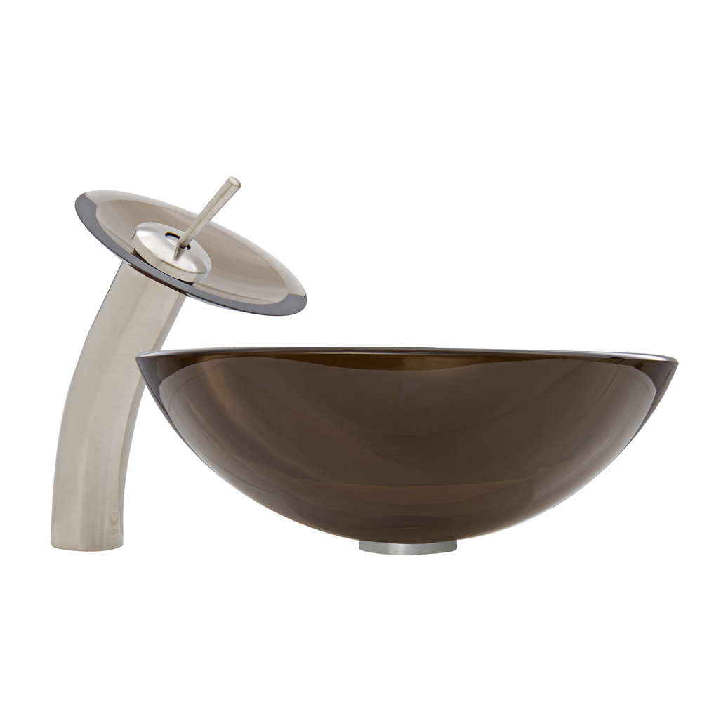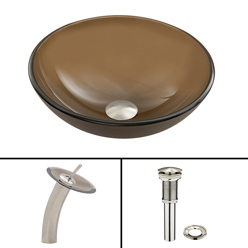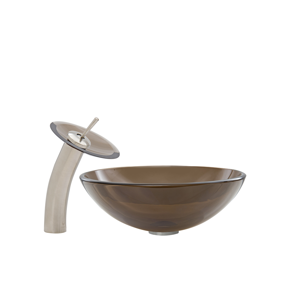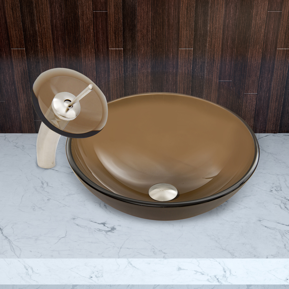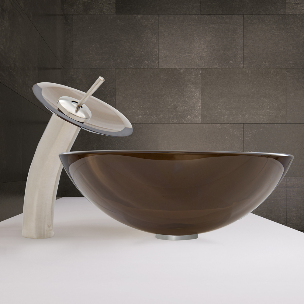 The VIGO Sheer Sepia Glass Vessel Sink and Waterfall Faucet Set in Brushed Nickel Finish will create a clean and modern, yet smooth and sleek addition to your bathroom.