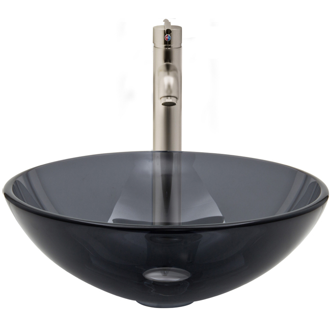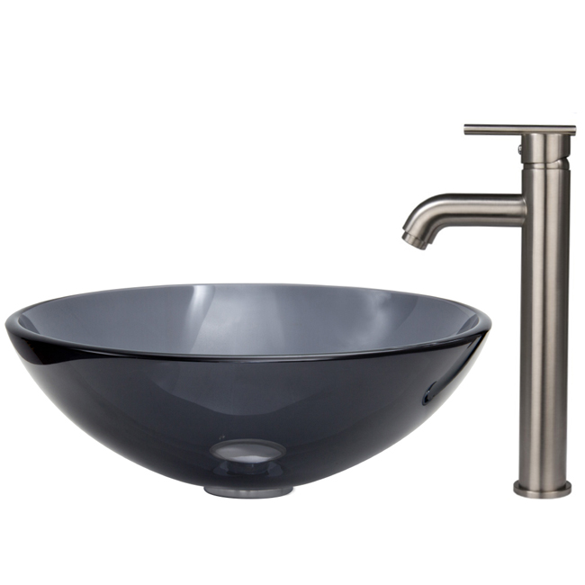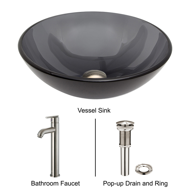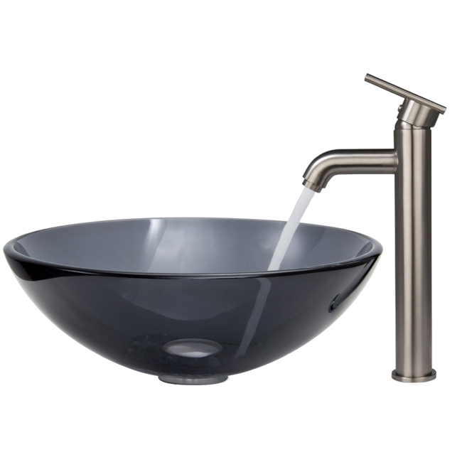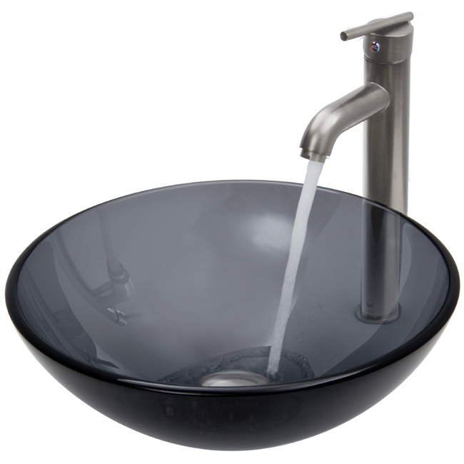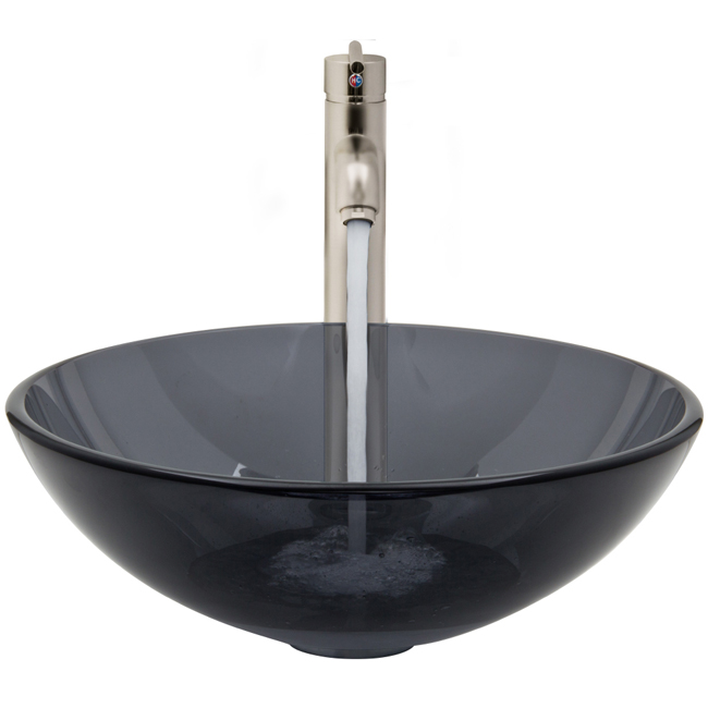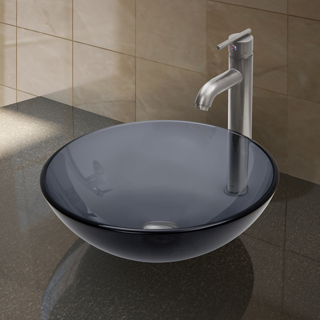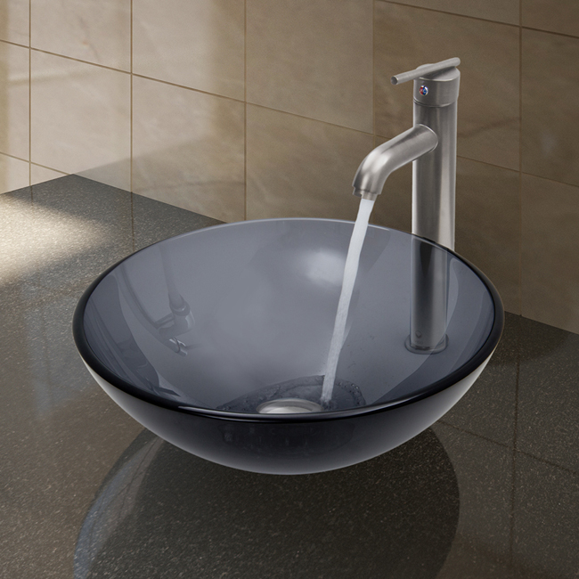 The VIGO Sheer Black glass vessel sink with Brushed Nickel faucet set is a modern and contemporary choice for any home.