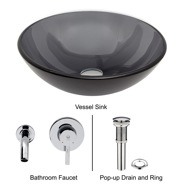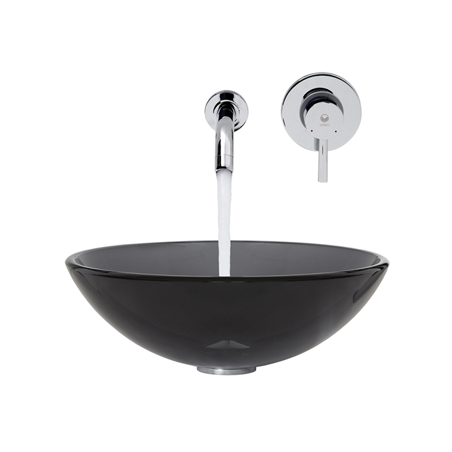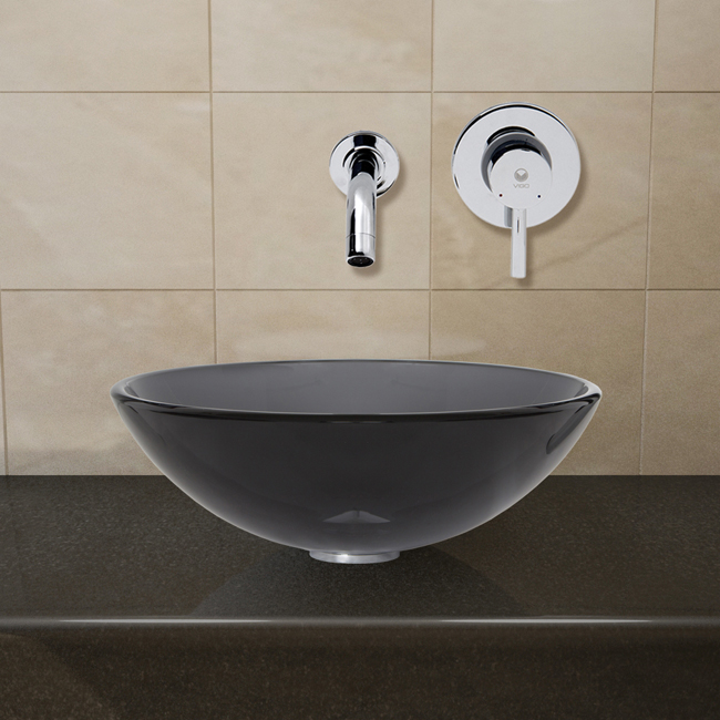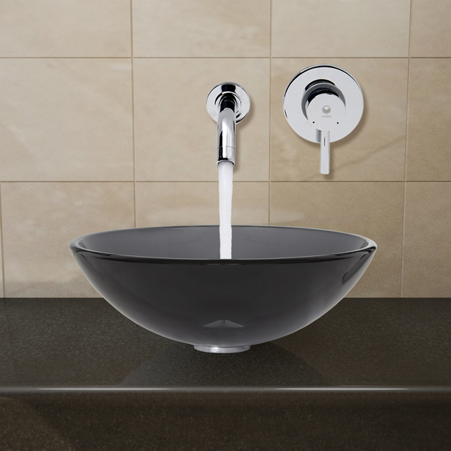 The VIGO Sheer Black glass vessel sink with Chrome wall mount faucet set is simply modern.
