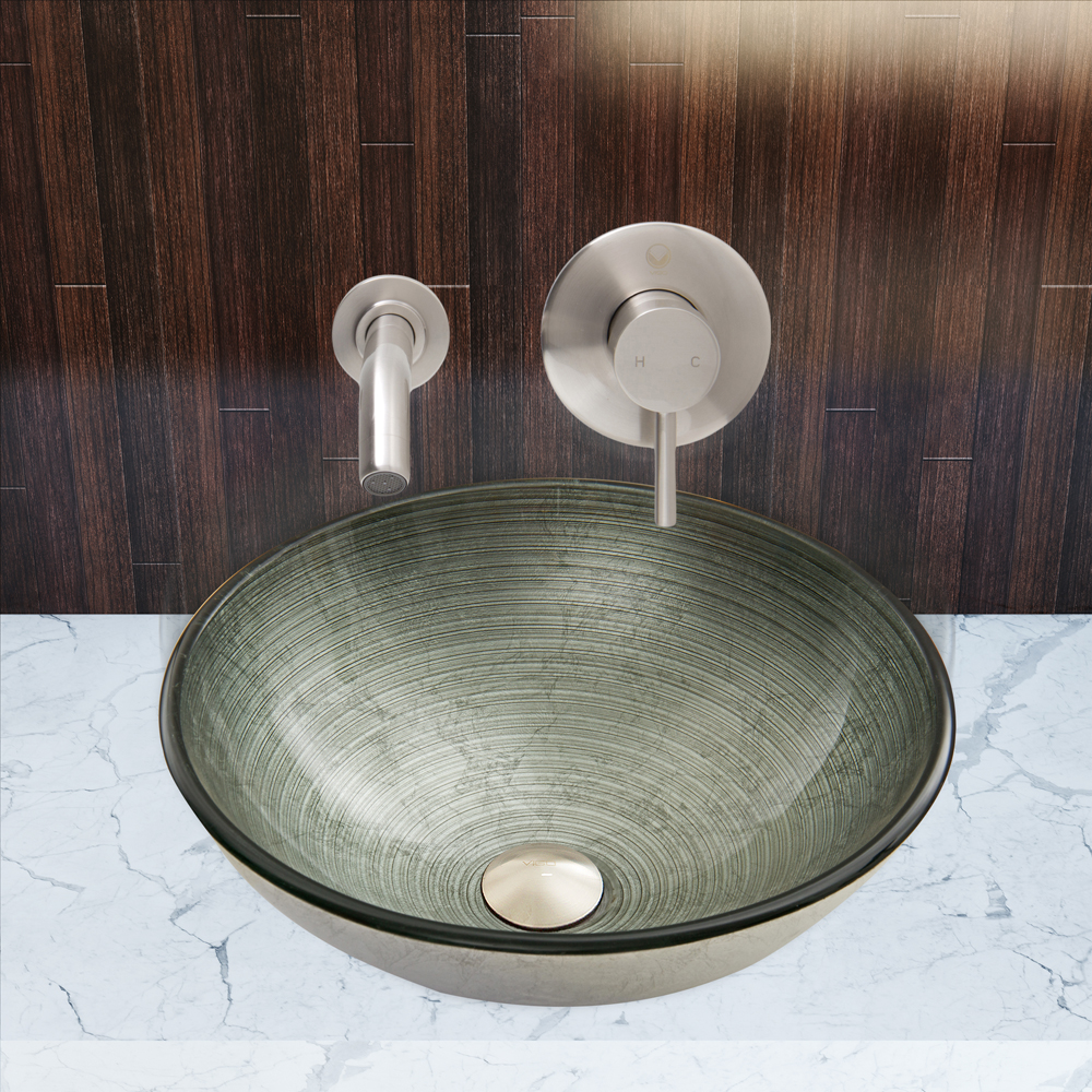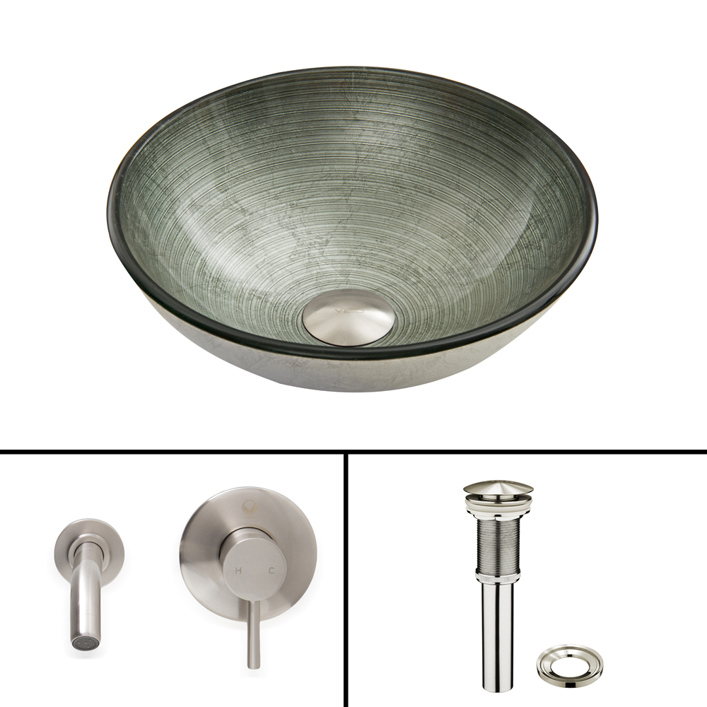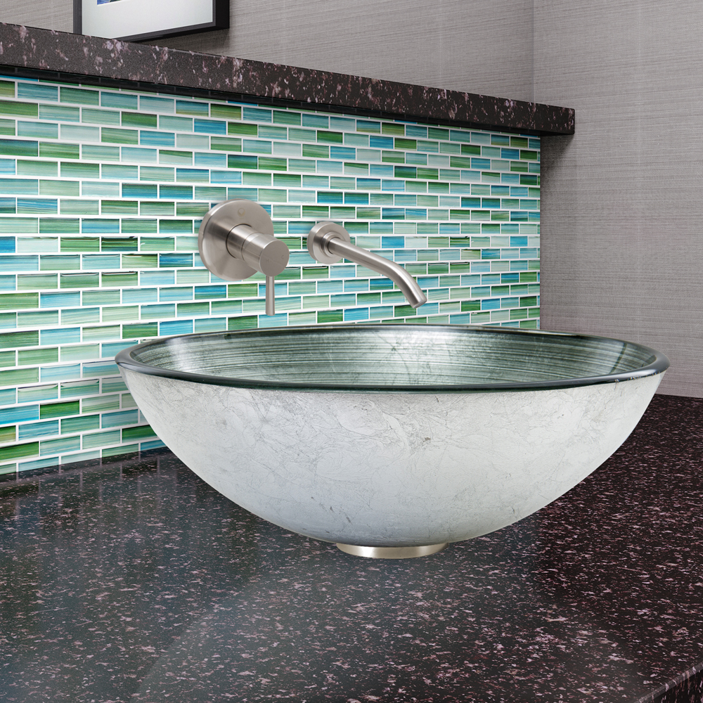 The VIGO Simply Silver Glass Vessel Sink and Olus Wall Mount Faucet Set in Brushed Nickel will simply brighten up your bathroom with minimal effort.