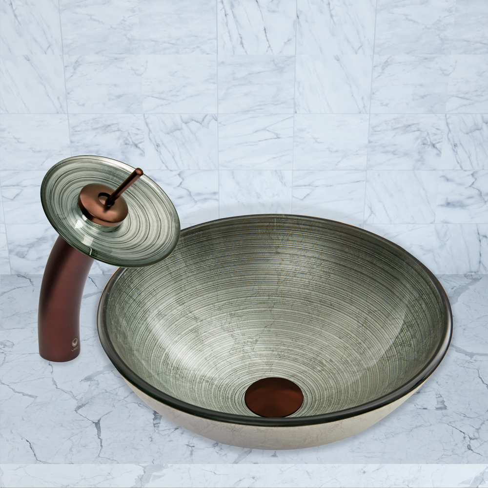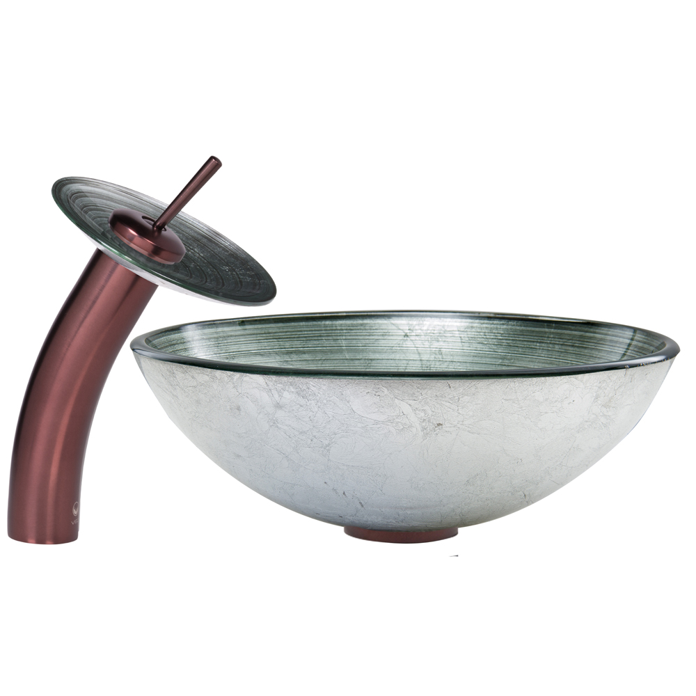 Brighten up your bathroom with the VIGO Simply Silver vessel sink and matching waterfall faucet in oil rubbed bronze. The hand spun metallic look of this sink will bring your bathroom the extra sparkle you've been looking for.