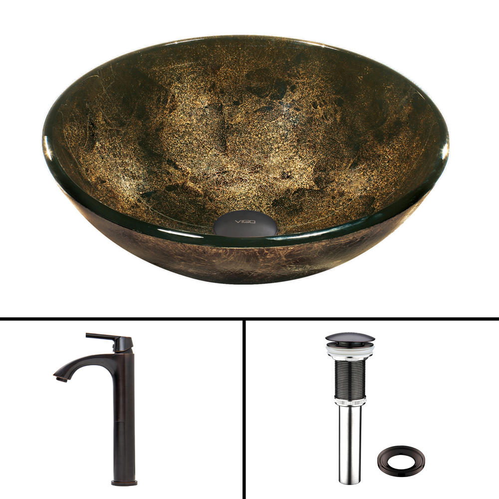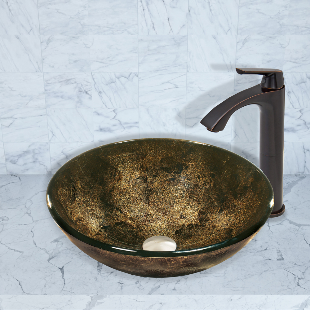 The VIGO Sintra Glass Vessel Sink and Linus Faucet Set in Antique Rubbed Bronze Finish will be sure to impress and make your bathroom stylish and luxurious.