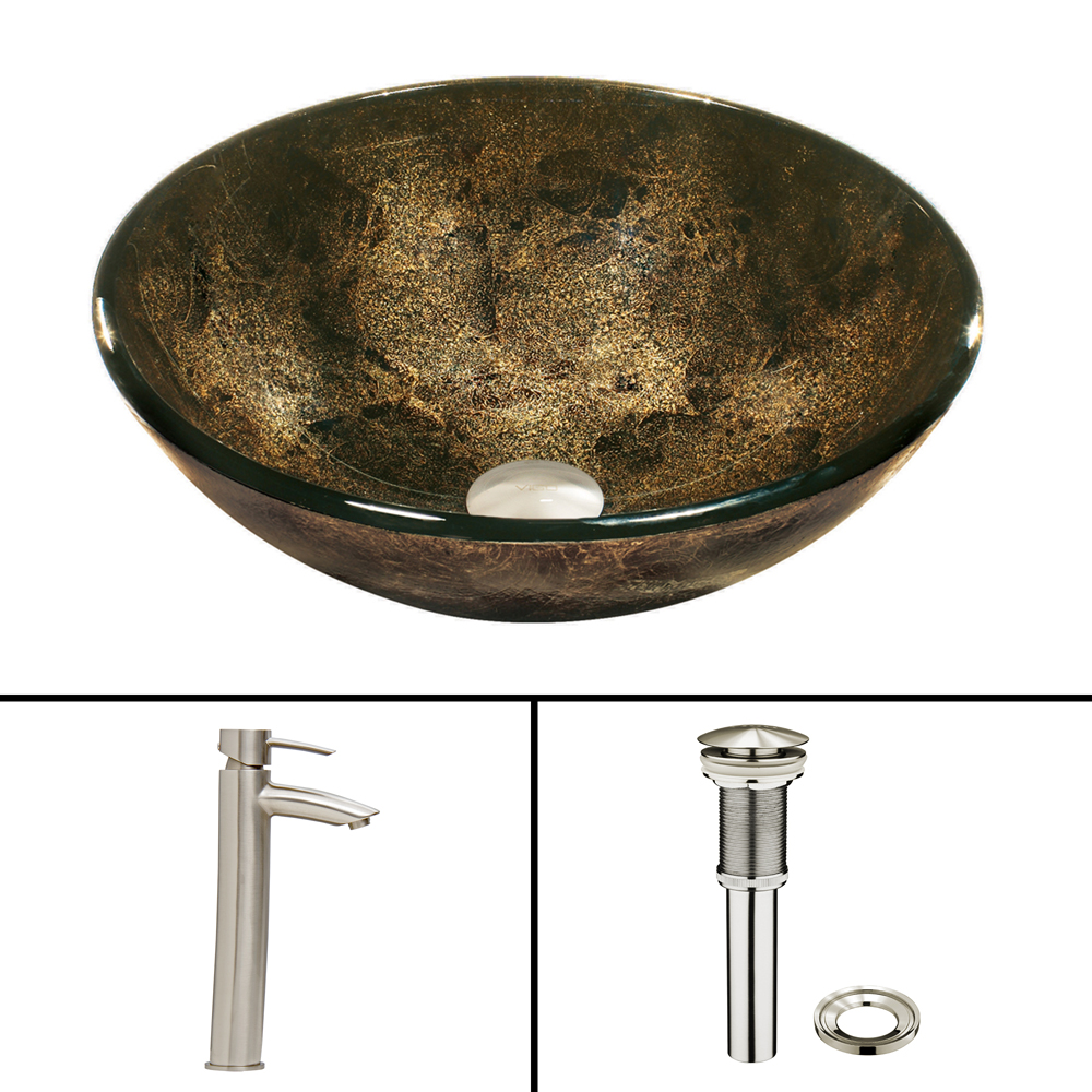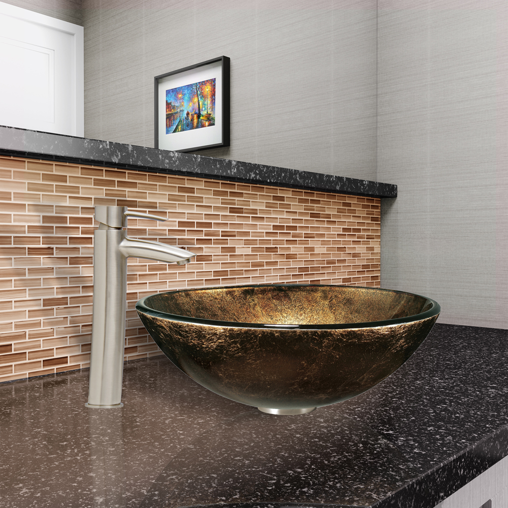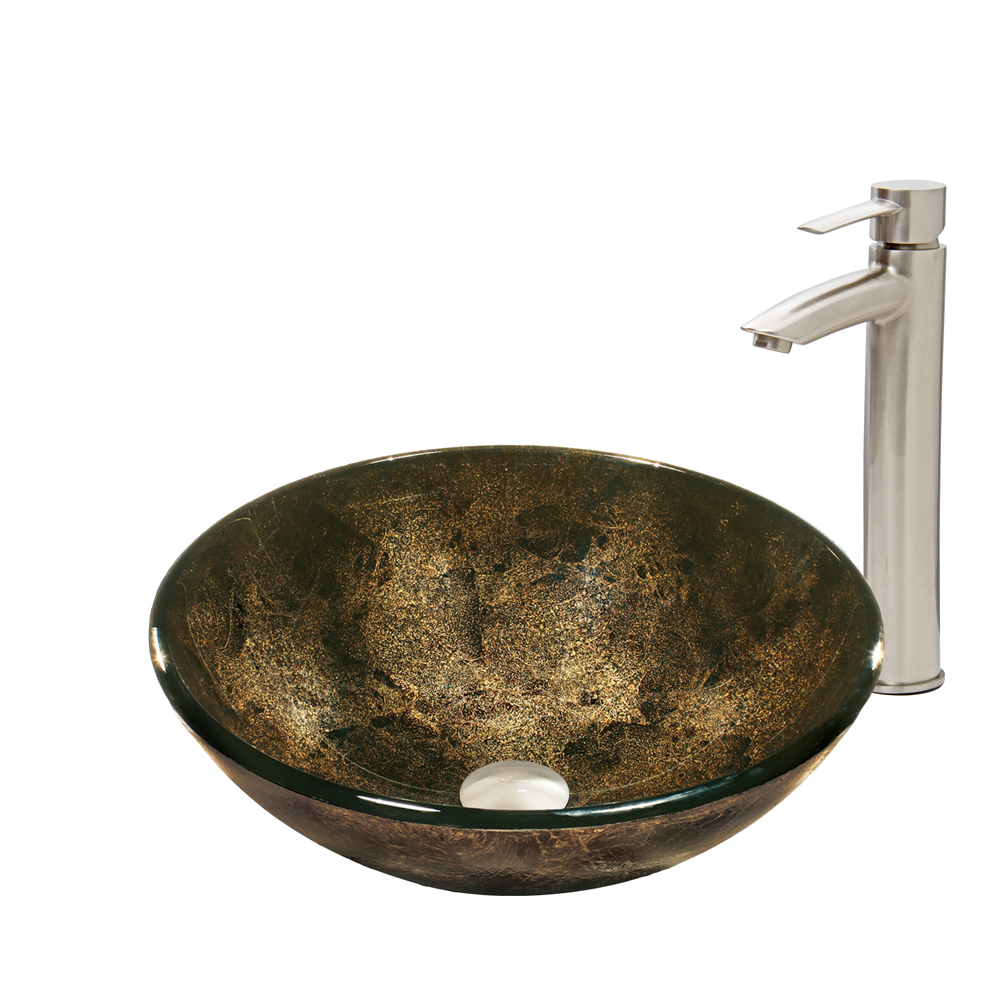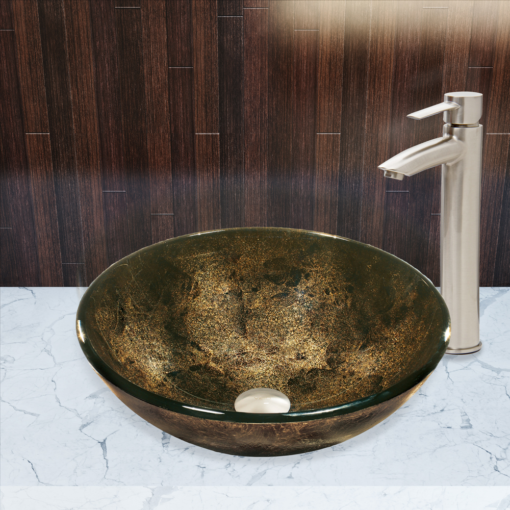 The VG07604 Sintra glass vessel bowl features gorgeous gold and black colors fused together, making it glow fiercely.