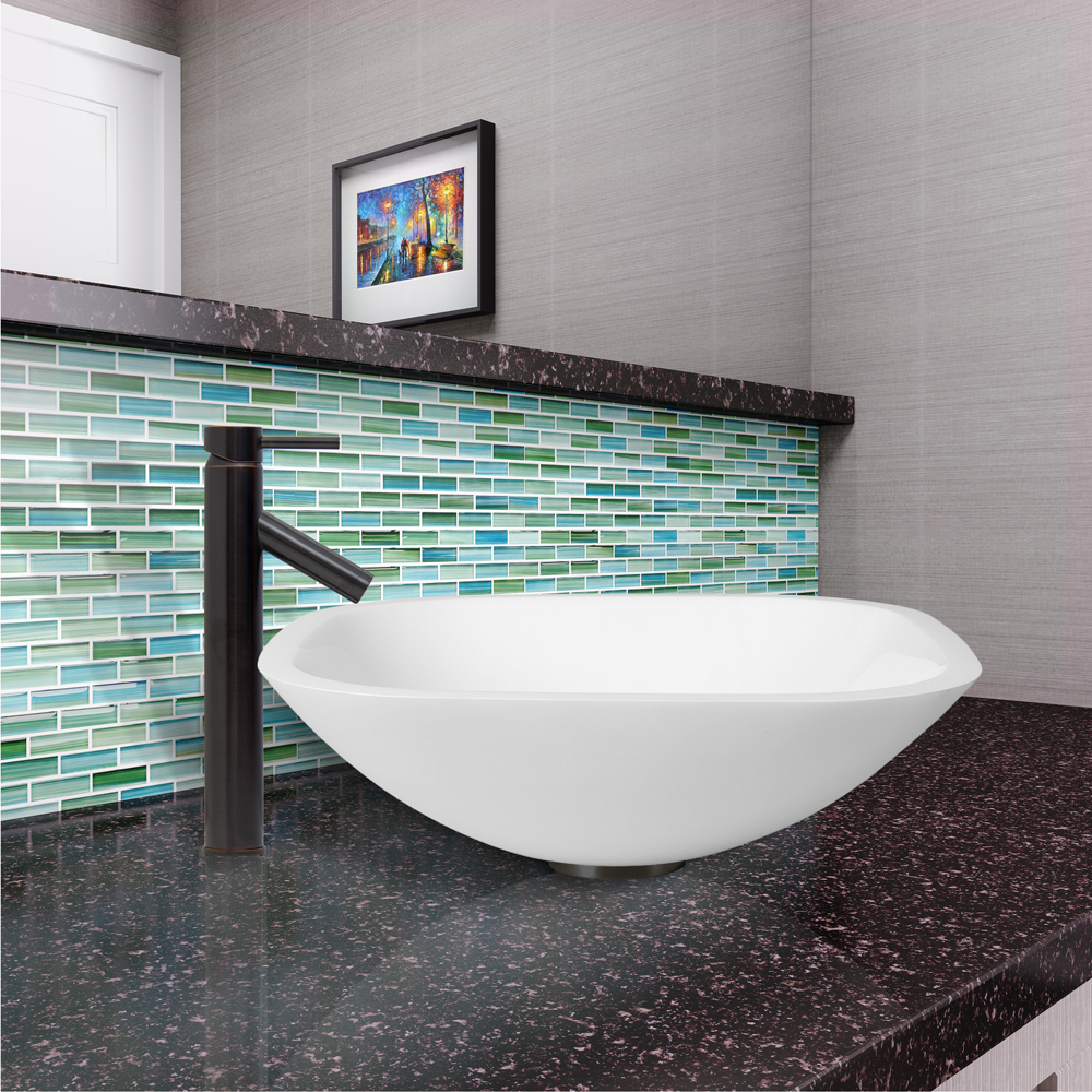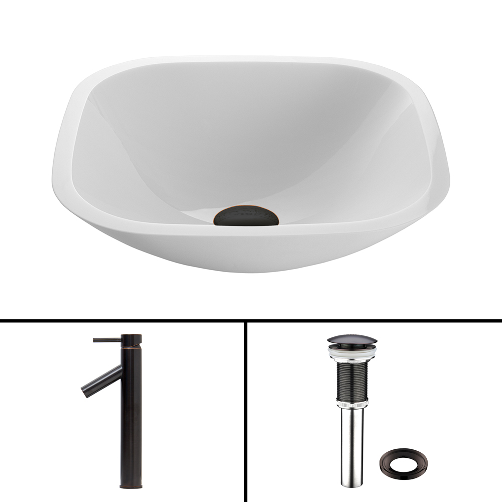 The VIGO Square Shaped White Phoenix Stone Glass Vessel Sink and Dior Faucet Set in Antique Rubbed Bronze Finish creates the perfect combination of classy and sassy for your new bathroom.