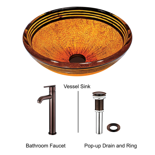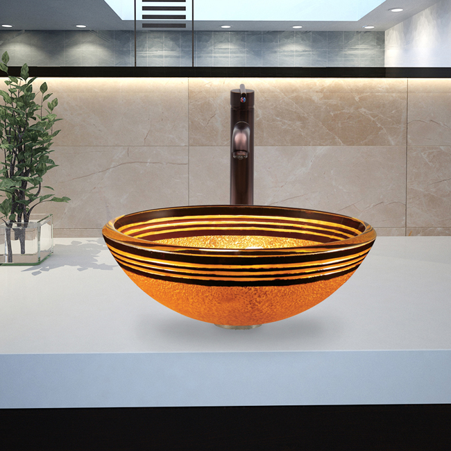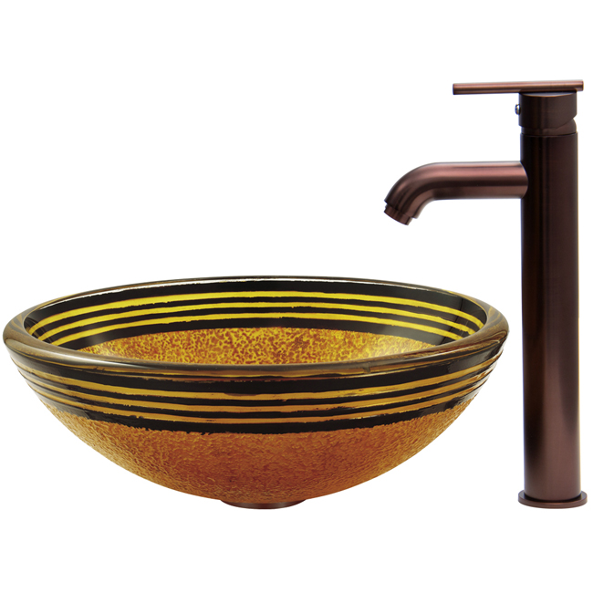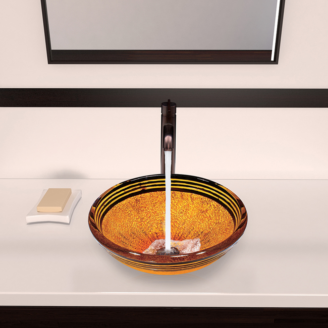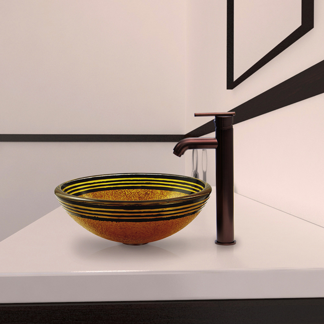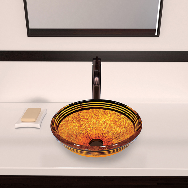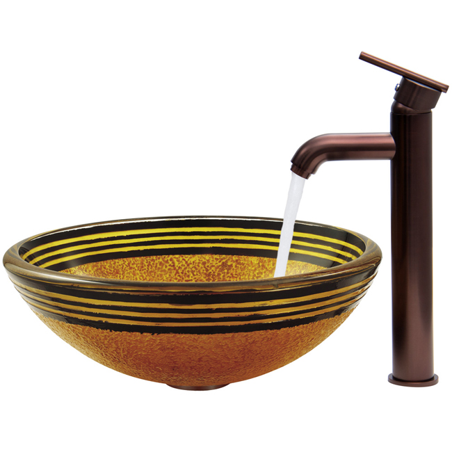 The VIGO Tangerine glass vessel sink and Seville faucet set in Oil Rubbed Bronze brings warmth and comfort to the bathroom.