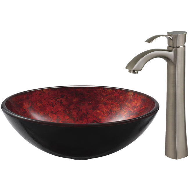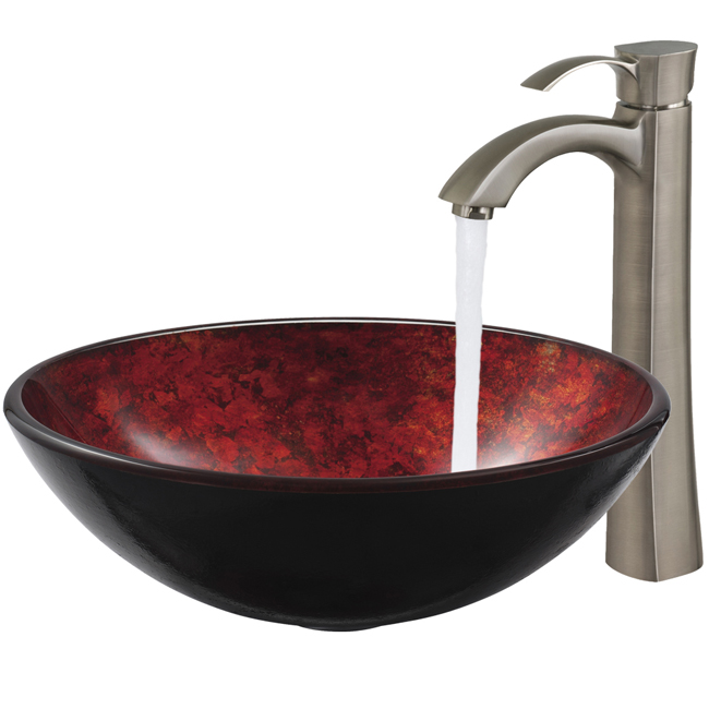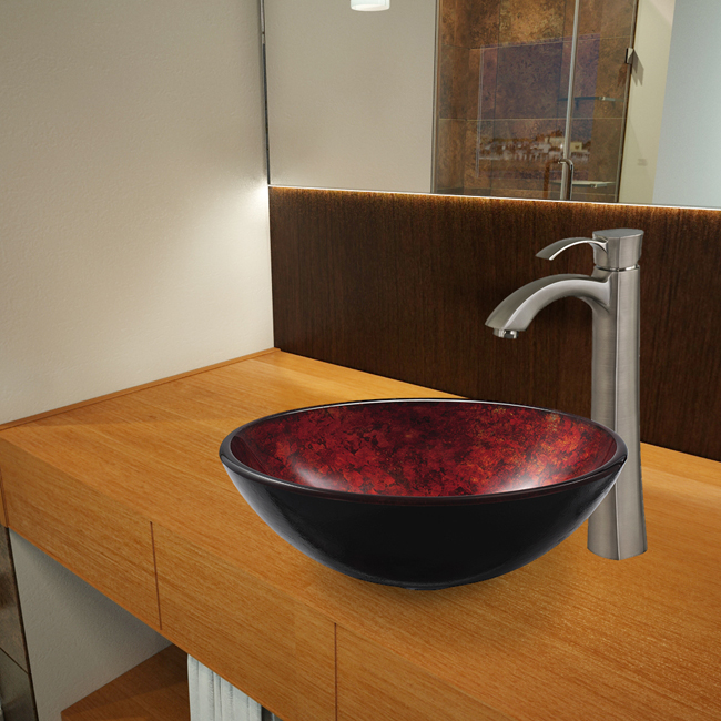 The VIGO Terrassa glass vessel sink and Otis faucet set in Brushed Nickel is radiant and elegant.