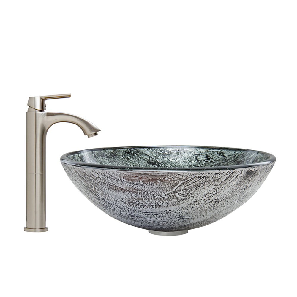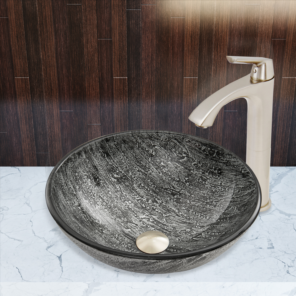 The VG07050 Titanium glass vessel bowl features a mixture of black and silver, sparkling like brilliant layers of titanium.