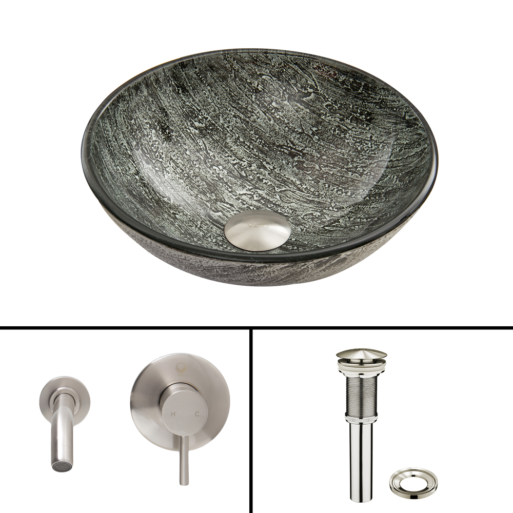 The VIGO Titanium Glass Vessel Sink and Olus Faucet Set in Brushed Nickel Finish will make your bathroom shine bright.