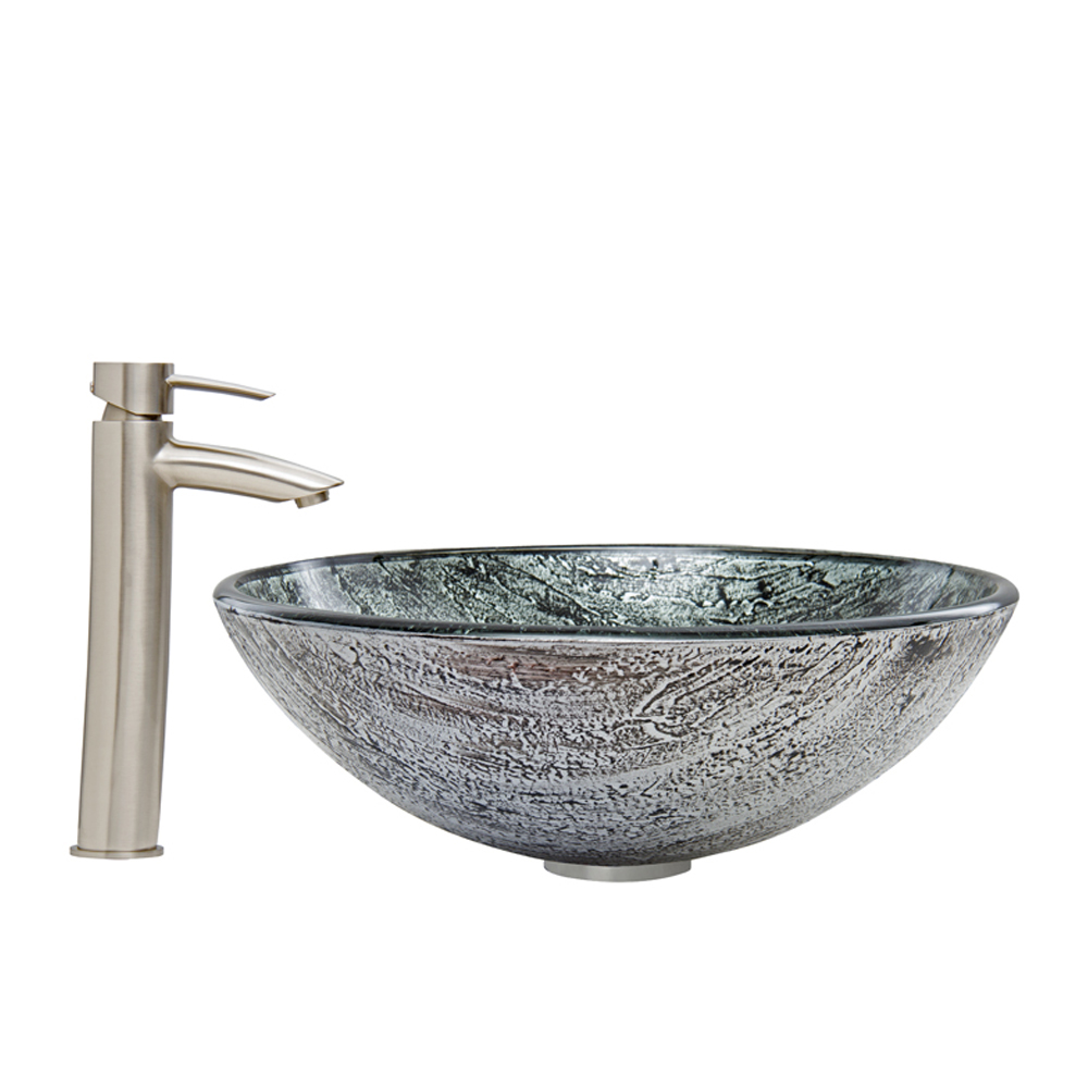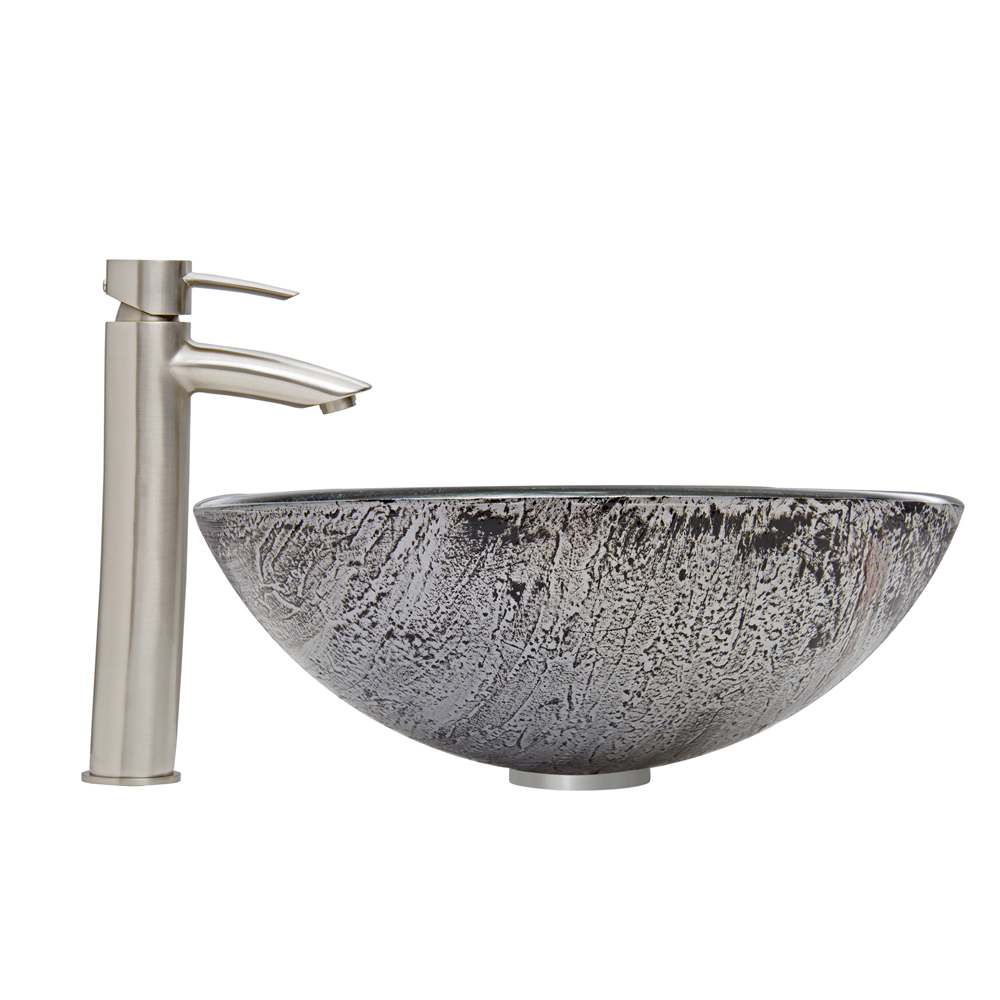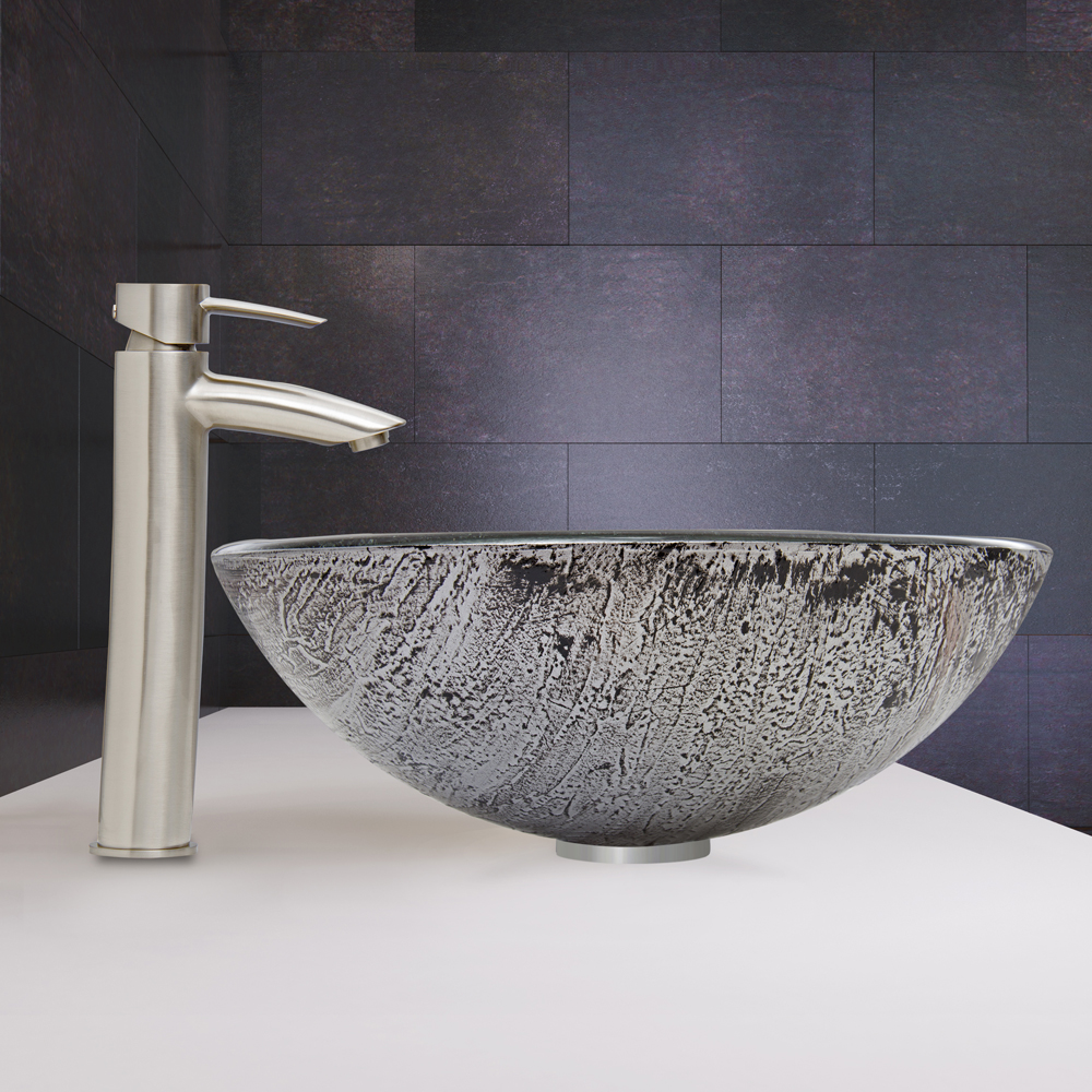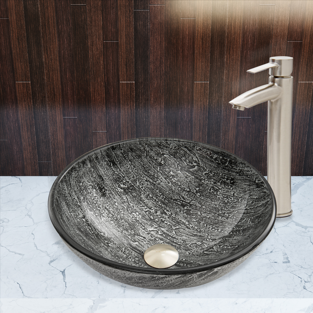 The VG07050 Titanium glass vessel bowl features a mixture of black and silver, sparkling like brilliant layers of titanium.
