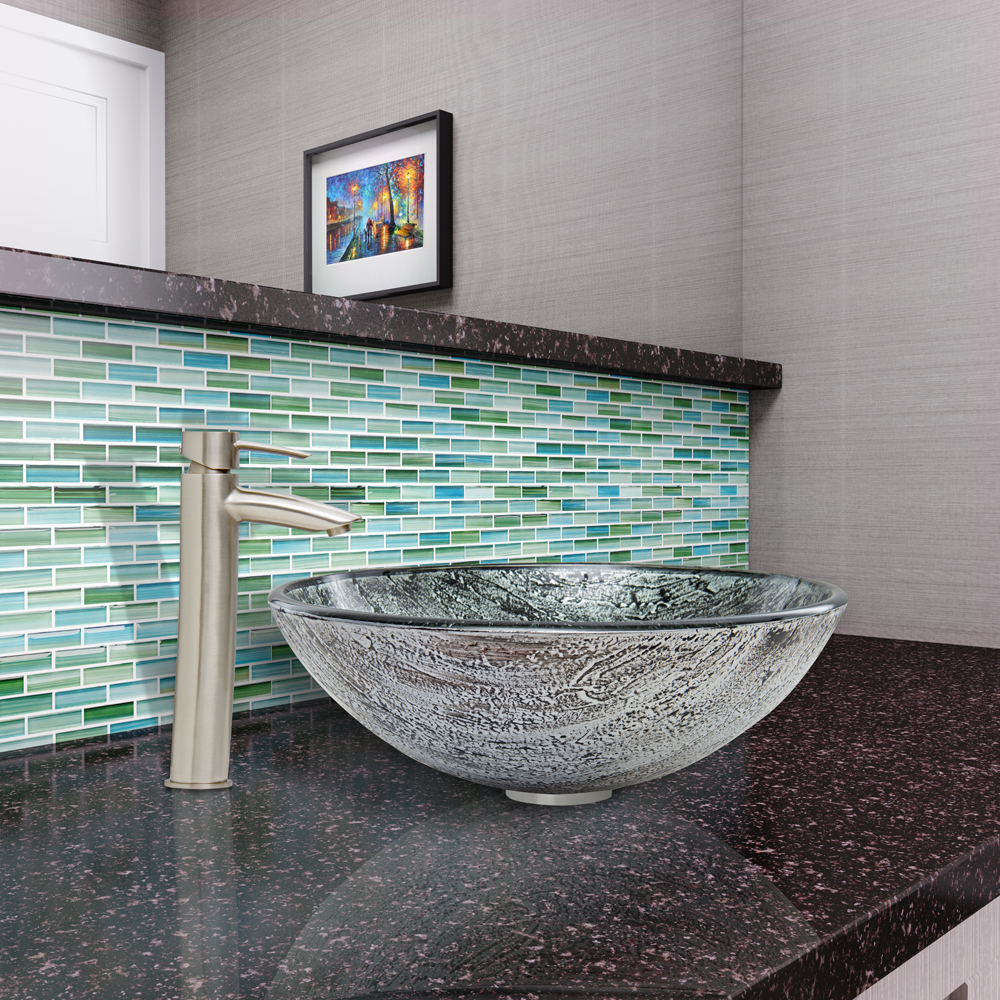 The VIGO Titanium Glass Vessel Sink and Shadow Faucet Set in Brushed Nickel Finish will make your bathroom shine bright.