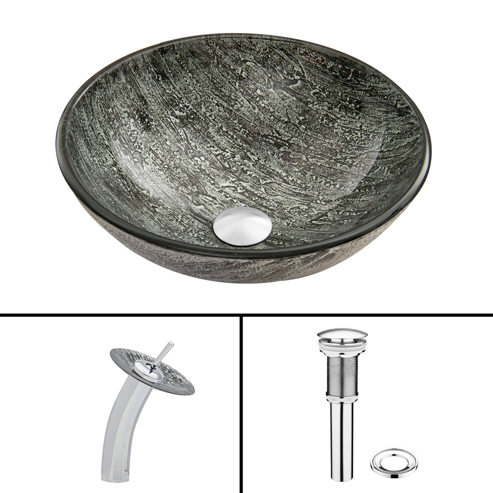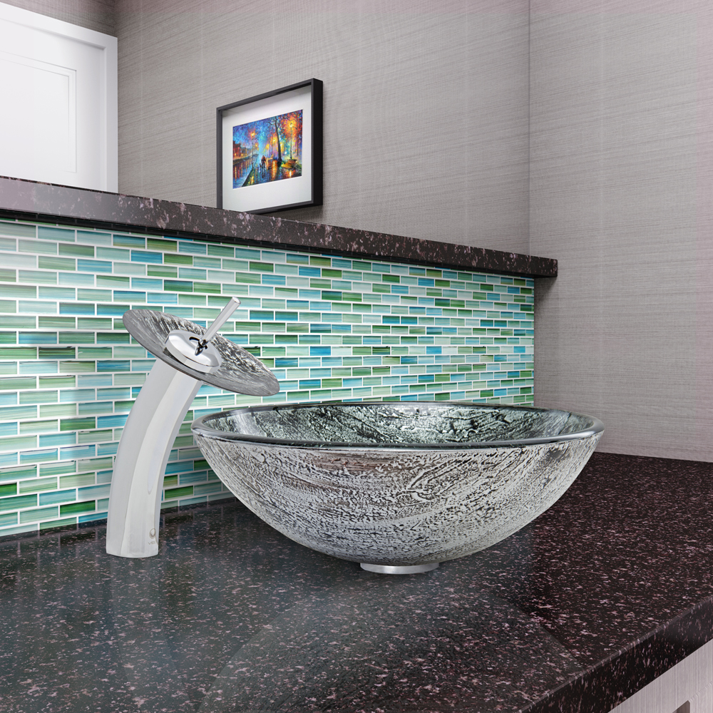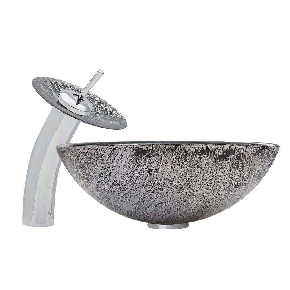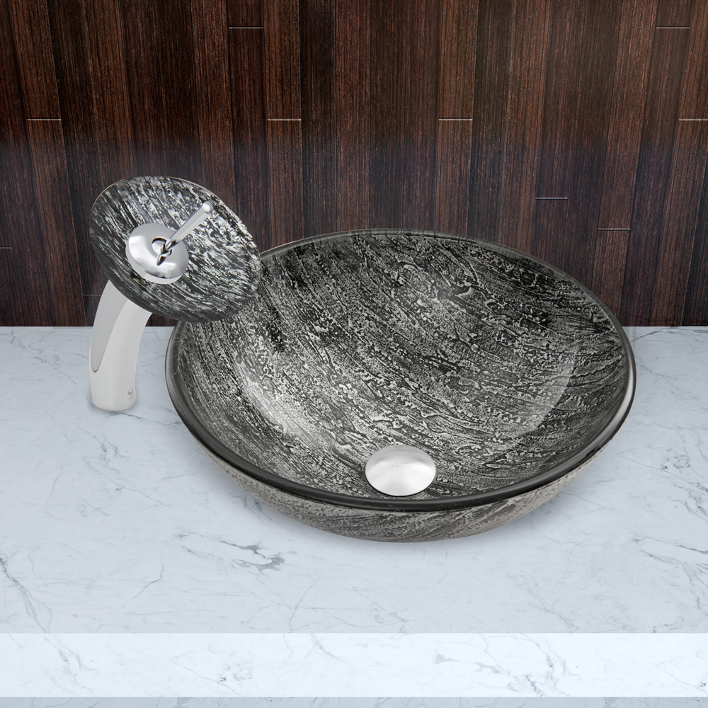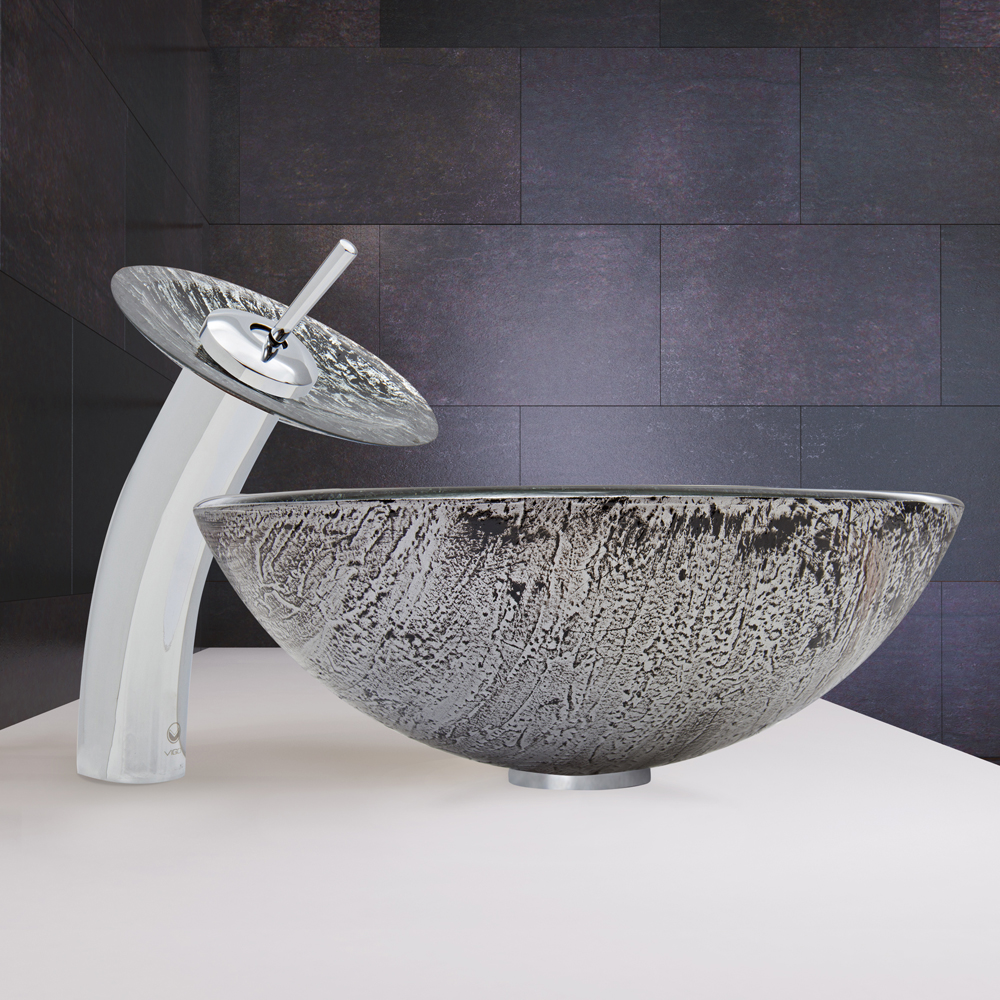 The VIGO Titanium vessel sink and matching waterfall faucet in chrome sparkles like brilliant layers of titanium in your new bathroom. A mixture of black and silver smudged together keep your bathroom interesting for years to come.