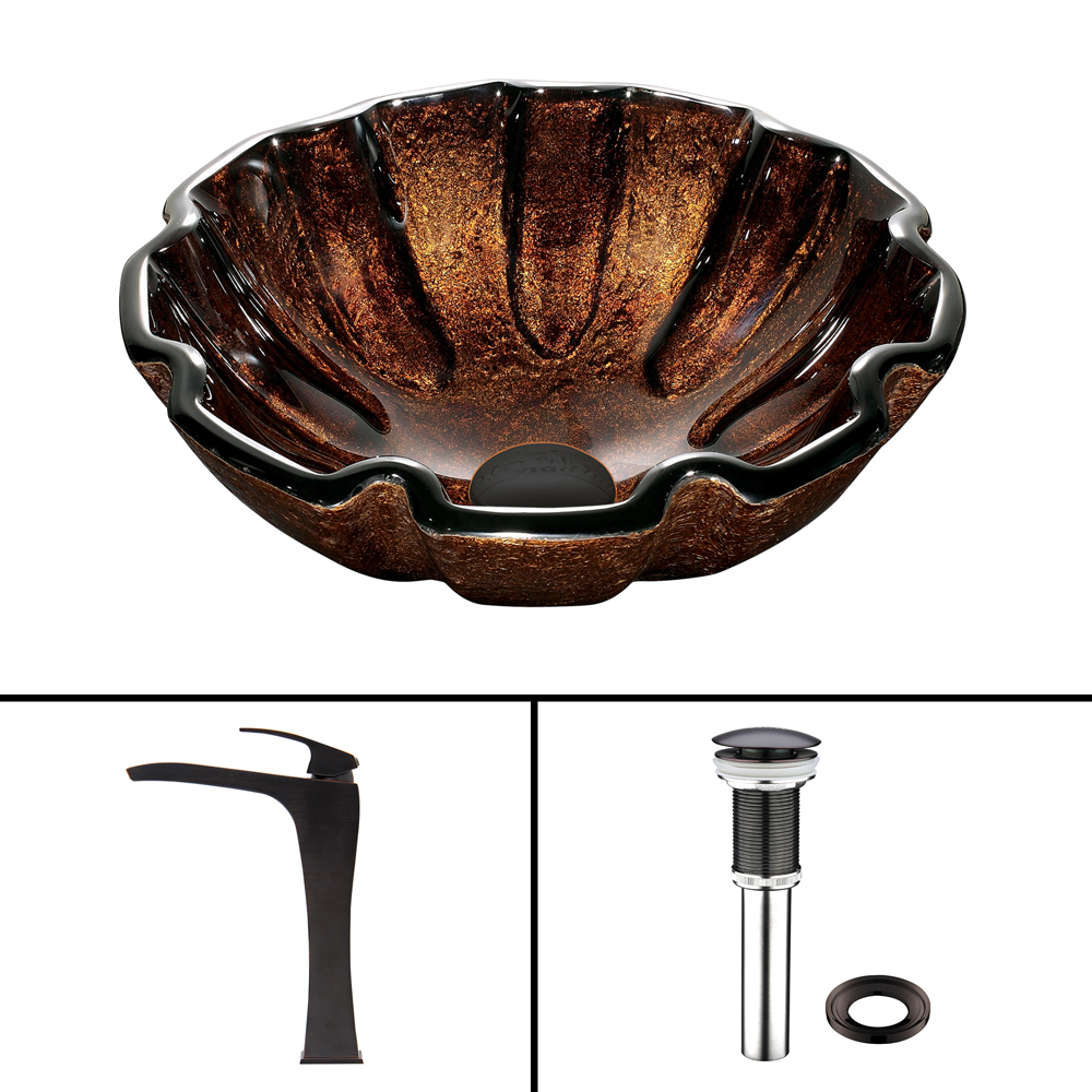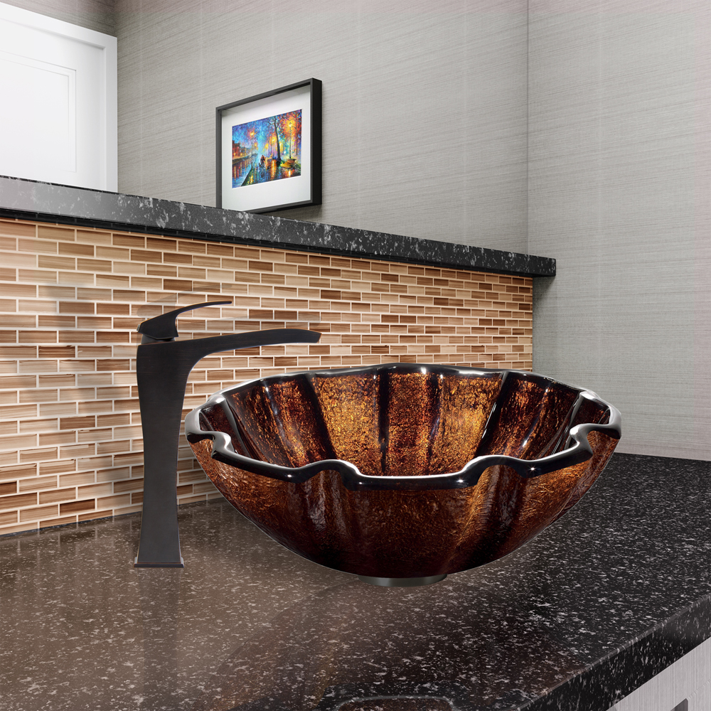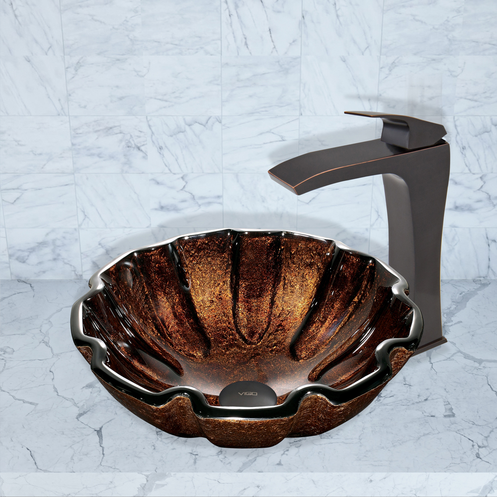 The VIGO Walnut Shell Glass Vessel Sink and Blackstonian Faucet Set in Antique Rubbed Bronze Finish will bring new life to your bathroom.
