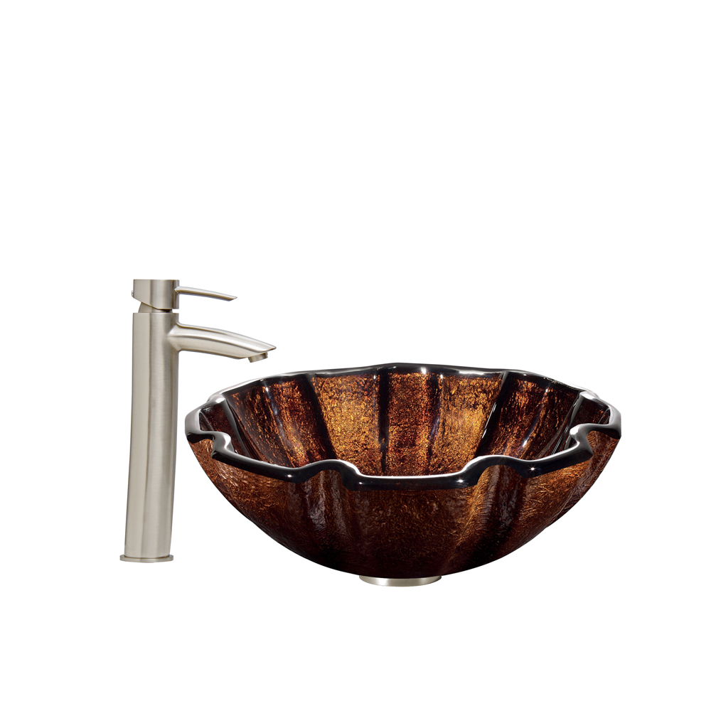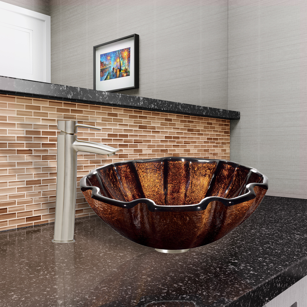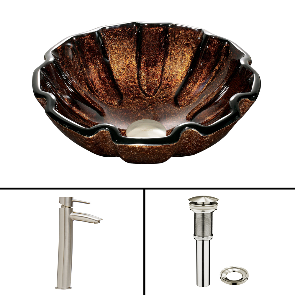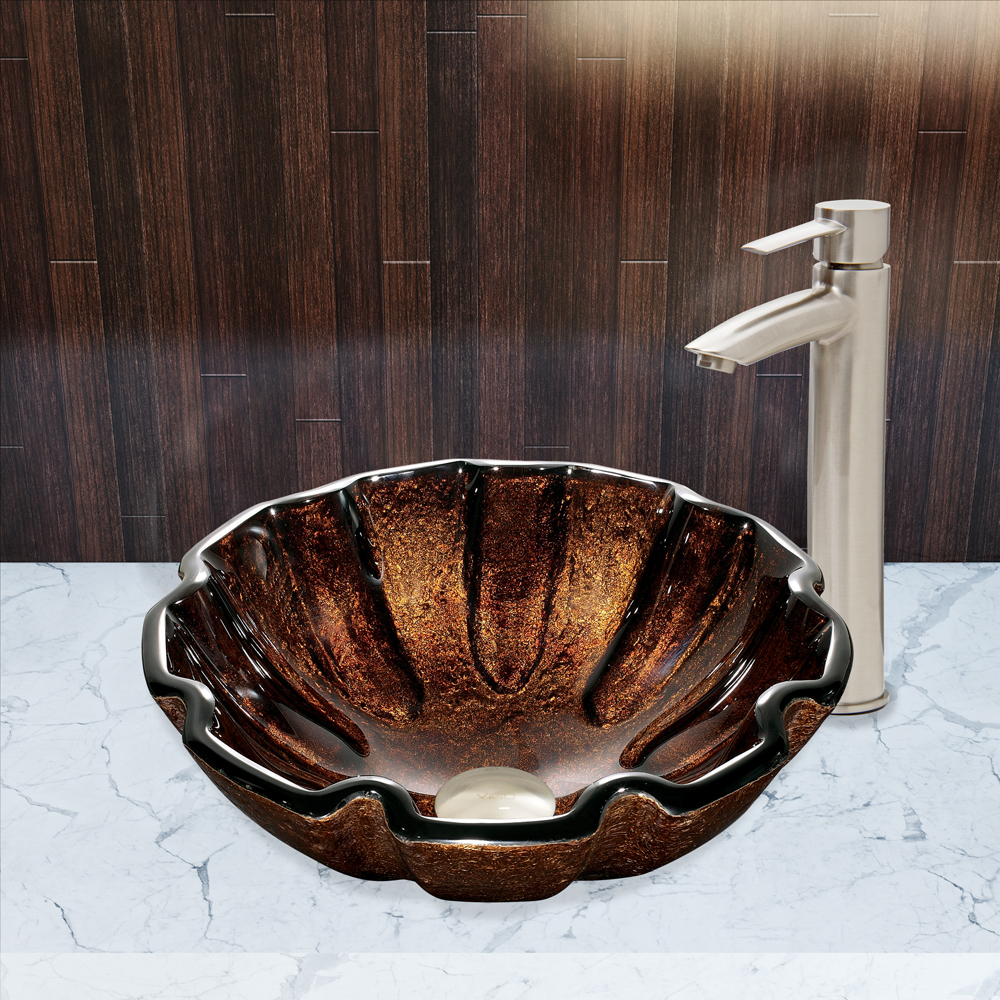 The VIGO Walnut Shell Glass Vessel Sink and Shadow Faucet Set in Brushed Nickel Finish will bring new life to your bathroom.